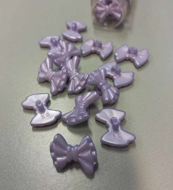Lila színű masni alakú műanyag gomb.