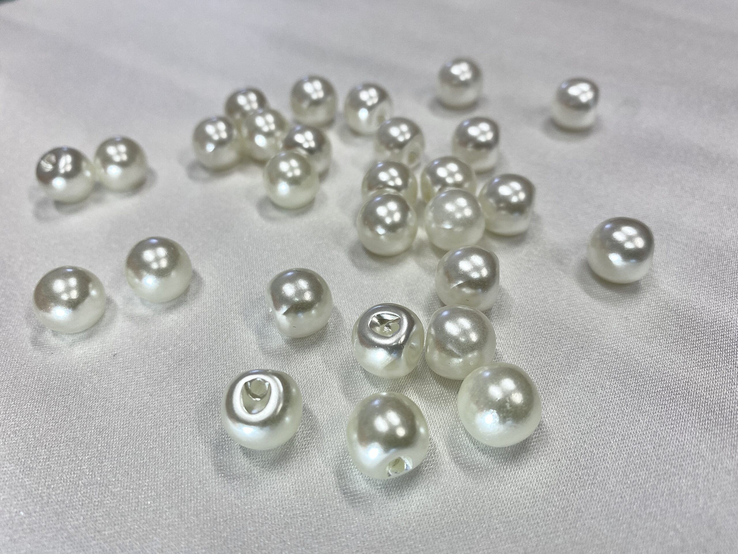 Krém színű, 9mm- es, műanyag tekla gyöngygomb. Hagyományos tűvel varrható. Alján lyukasztva.