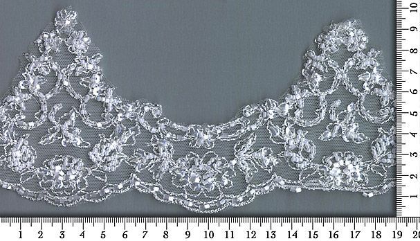 Fehér tüll alapra hímzett szegő csipke, ezüst szállal, gyöngyökkel. 9cm széles.