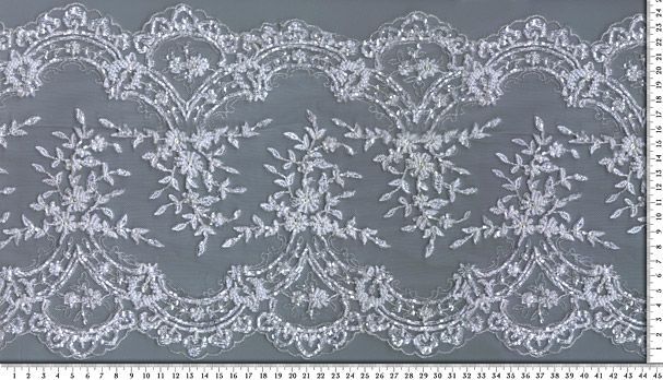 Fehér, fehér tüll alapra hímzett szegő csipke, gyöngyökkel, kristályokkal. 25cm széles.