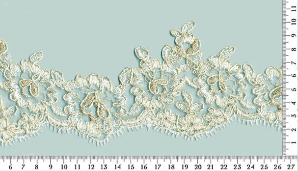 Fehér, fehér tüll alapra hímzett, zsinórozott, ezüst szálas szegő csipke. 8cm széles.
