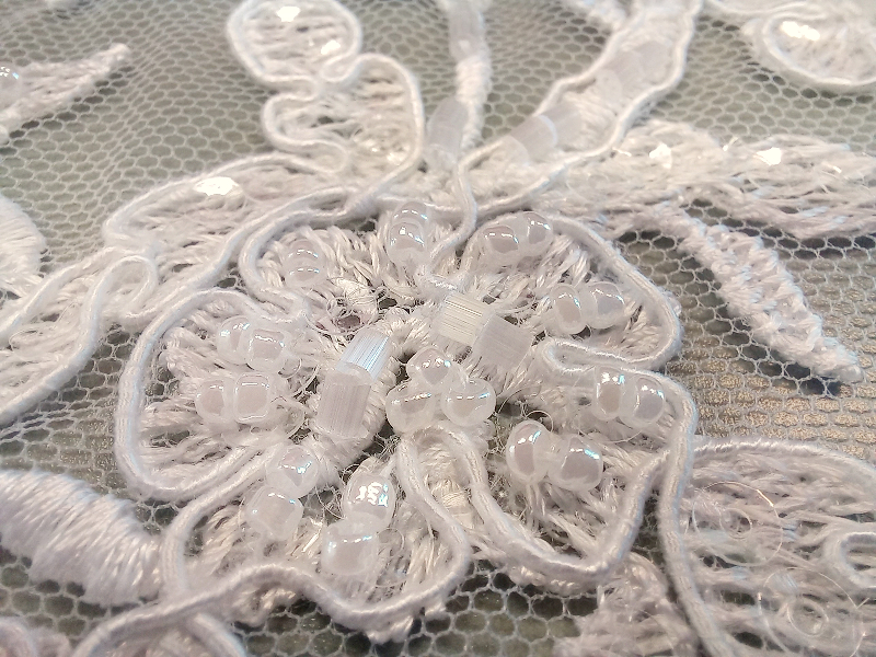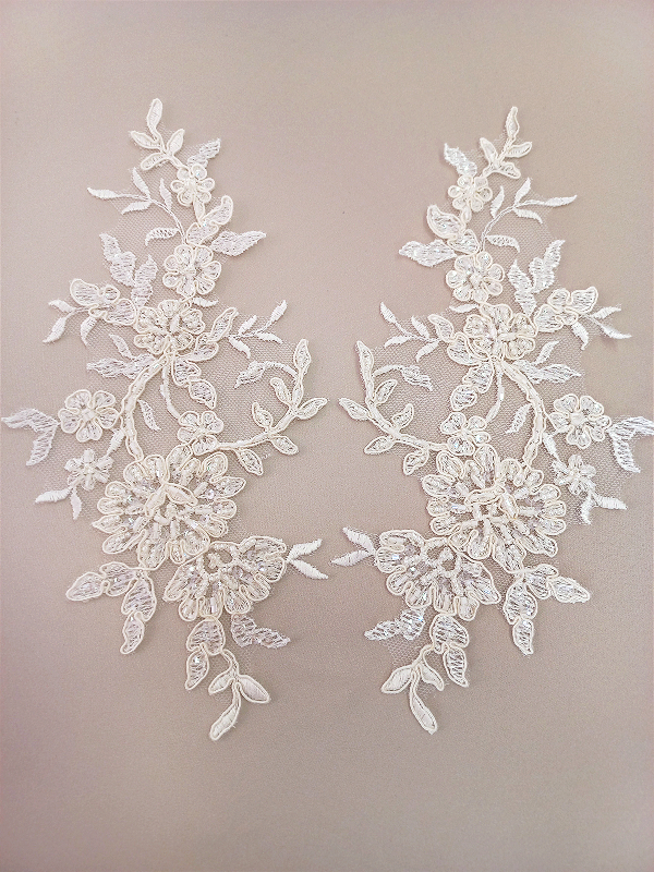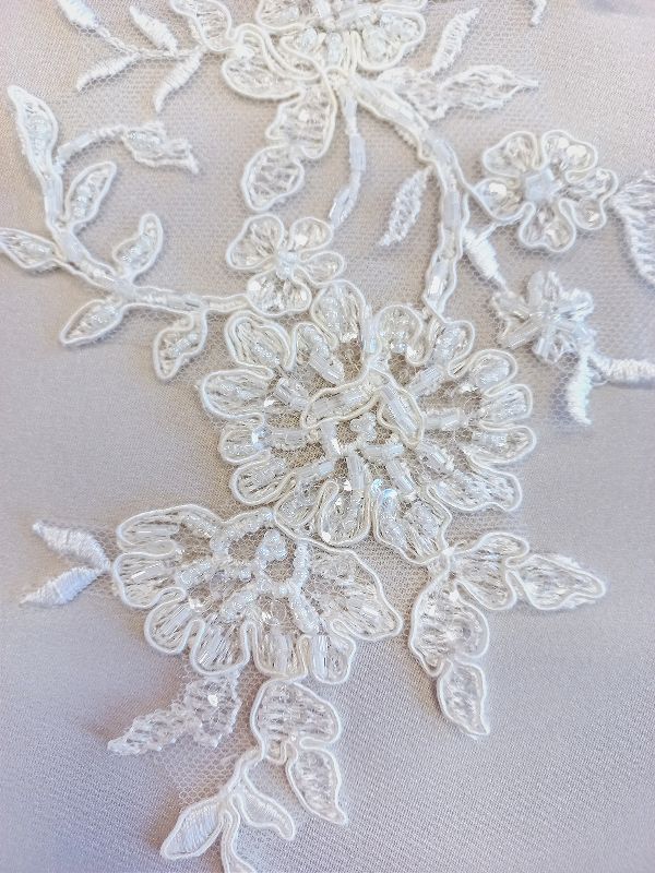 Tüll alapra hímzett gyöngyözött, krém, zsinórozott páros csipke.