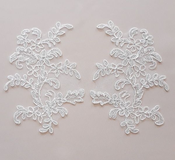 Krém színű, zsinórozott, ezüst szállal átszőtt páros csipke. Tüll alapra hímzett.