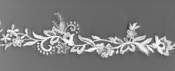 Fehér színű, tüll alapú, matt és selyemfényű szállal hímzett, flitteres csipke szegő.