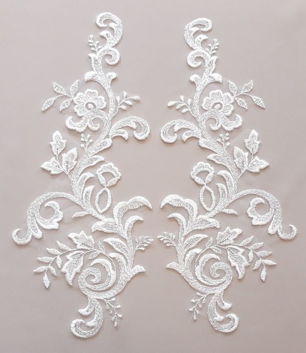 Törtfehér színű, hímzett páros csipke. Tüll alapra hímzett.