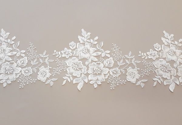 Ez a törtfehér csipkeszegő tökéletes választás menyasszonyi ruhák és fátylak szegélyezéséhez. A különleges virágmotívumokat finom, gyöngyhatású ágacskás minták egészítik ki, amelyek légies, romantikus összhatást keltenek. A hímzés tüll alapra készül, így a csipke elegánsan illeszkedik a ruha vonalához.