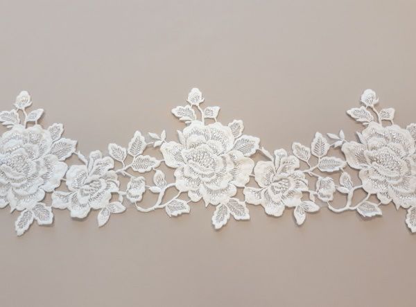 Ez a törtfehér csipkeszegő kifejezetten menyasszonyi ruhák és fátylak szegélyezéséhez készült. A dúsan hímzett, jellegzetes nagy virágos minta egyenes sorban fut, ahol a nagyobb és kisebb virágmotívumok váltakoznak, így a csipke könnyen és pontosan motívumokra osztható.