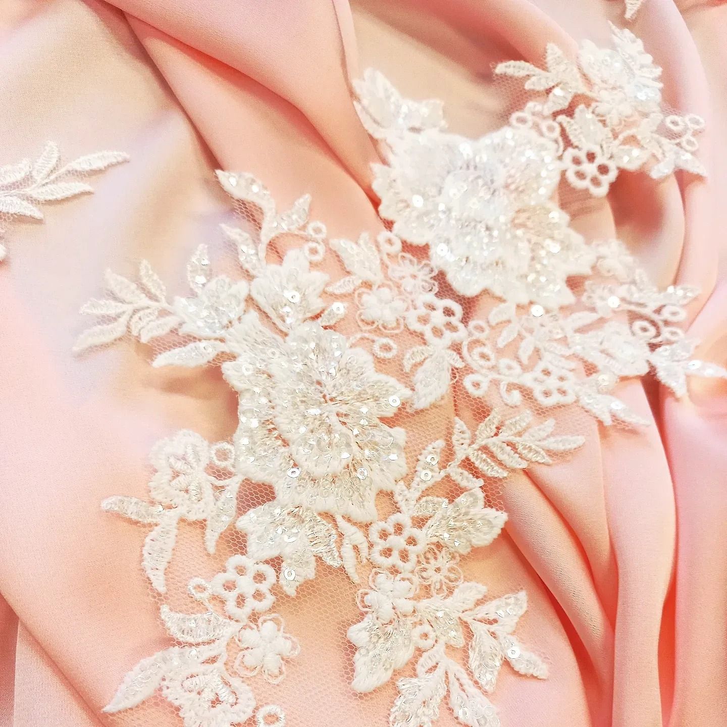 A páros kivitel lehetővé teszi a szimmetrikus elhelyezést ruhák elején, hátán vagy hangsúlyos betétként. A csipke könnyen kisebb motívumokra osztható, így rugalmasan felhasználható különböző szabásvonalakhoz. Kiemelt előnye, hogy ugyanazzal a mintával szegő csipke is kapható, amely szintén jól vágható motívumokra, így a ruha és a fátyol egységes stílusban készülhet el.