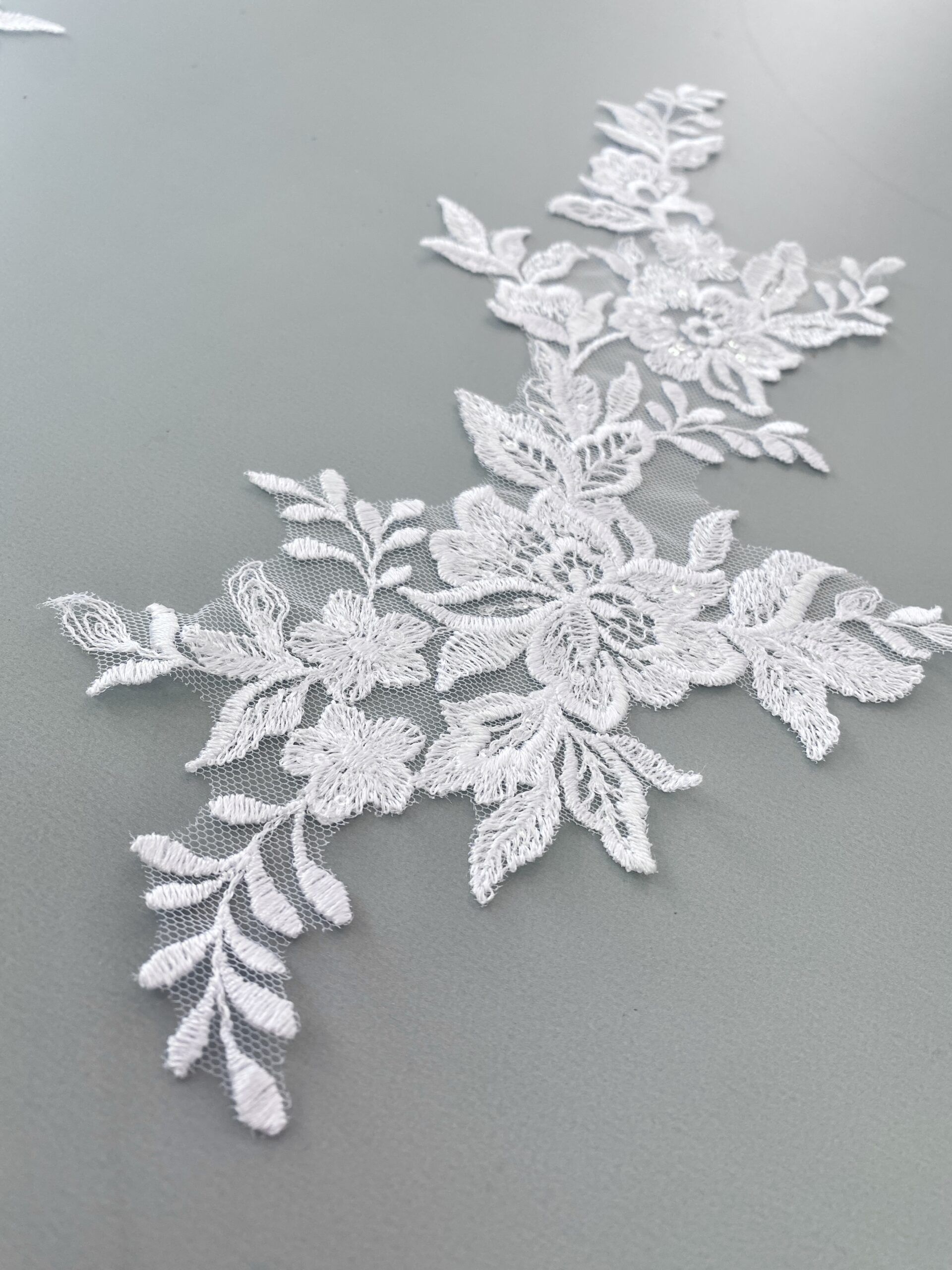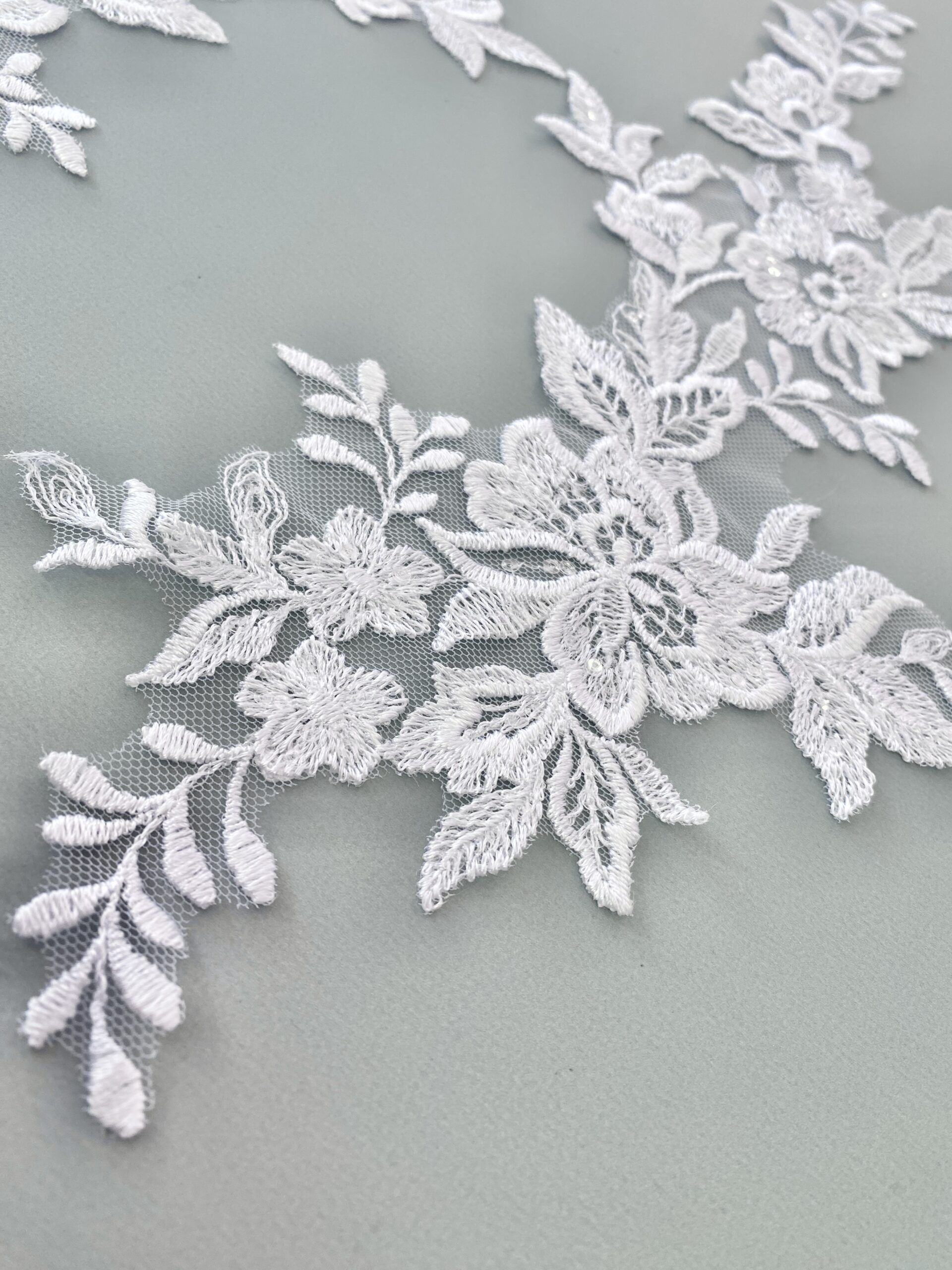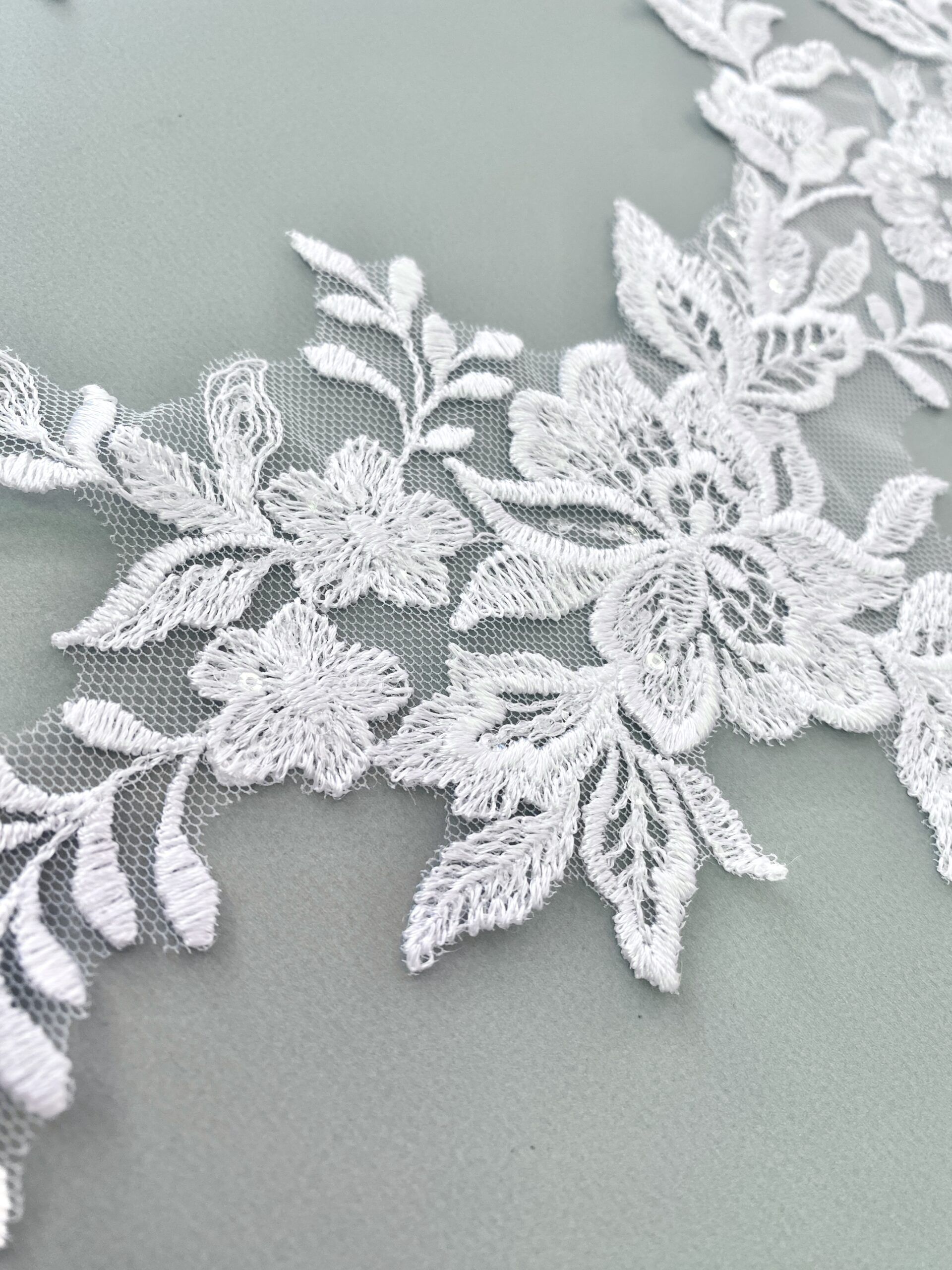 Fehér színű, tüll alapra hímzett páros csipke. Átlátszó flitterekkel díszítve.