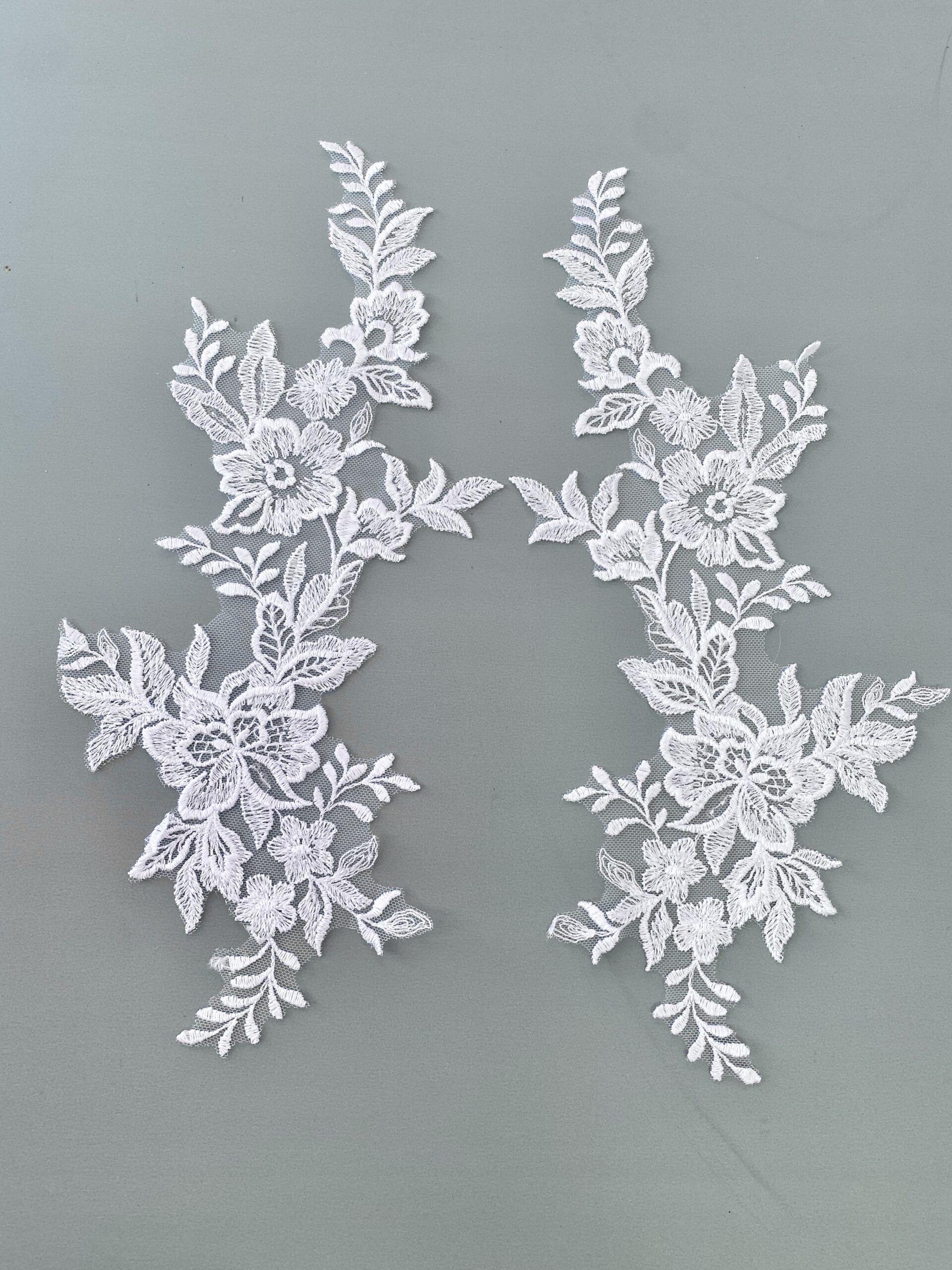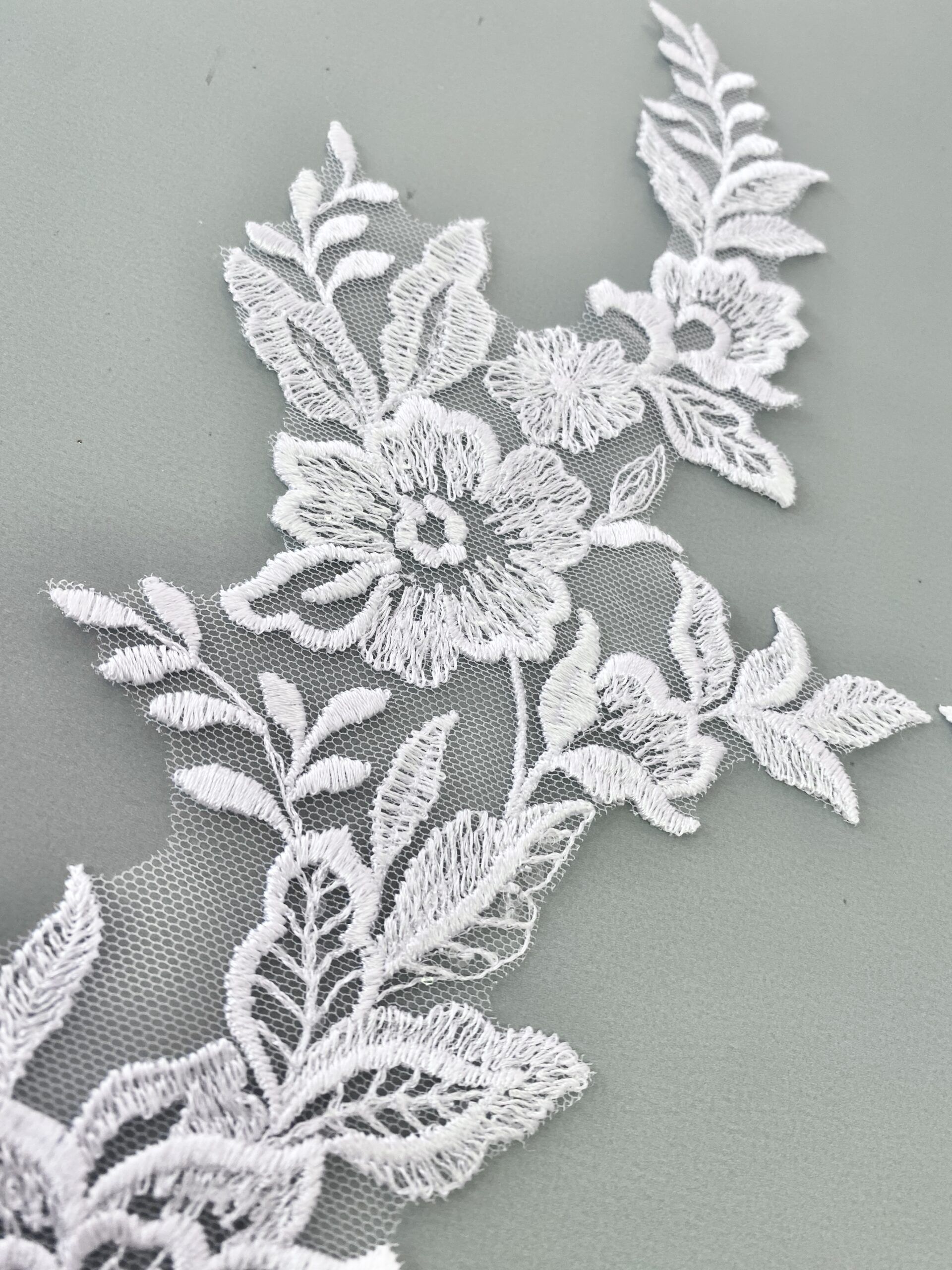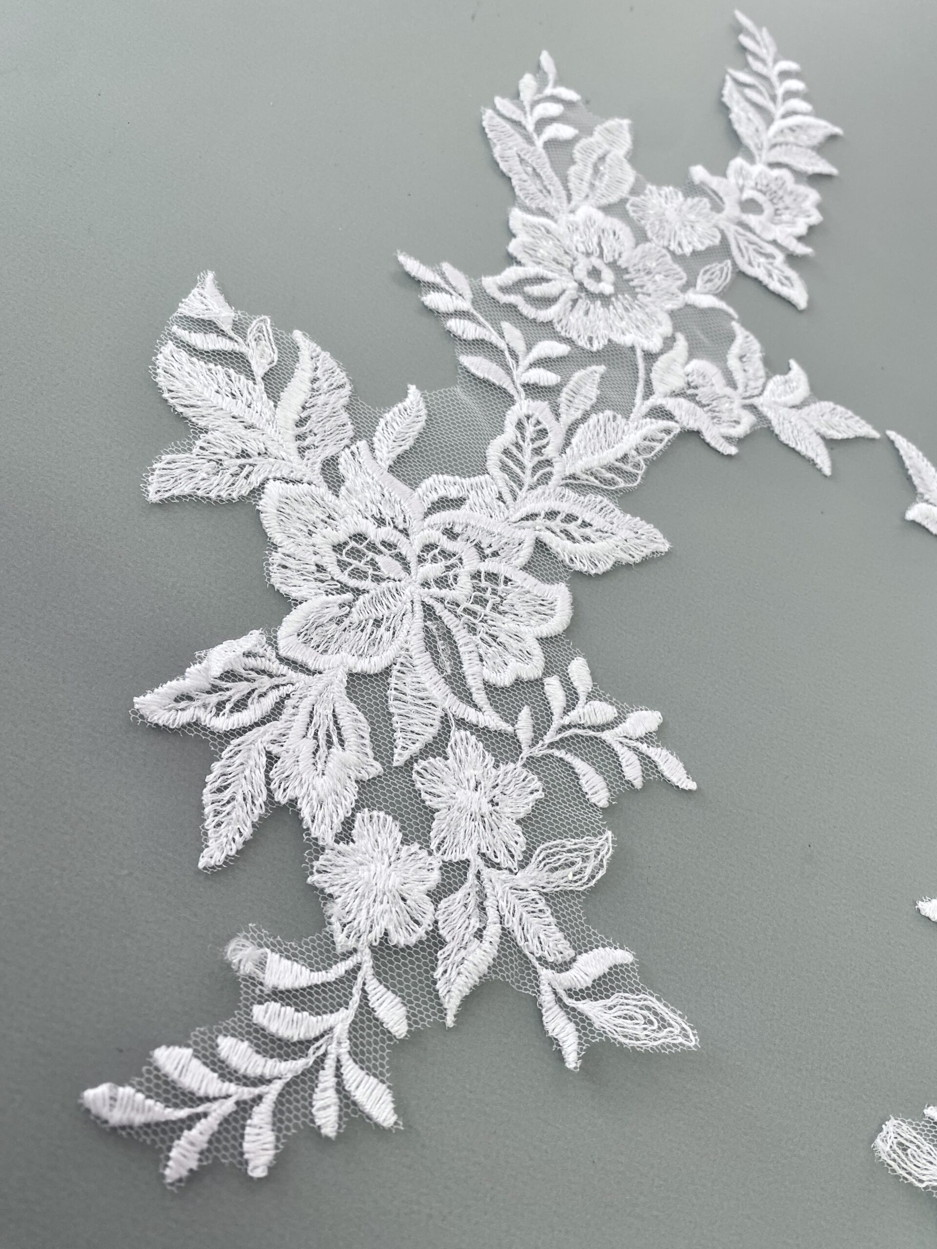 Fehér színű, tüll alapra hímzett páros csipke. Átlátszó flitterekkel díszítve.