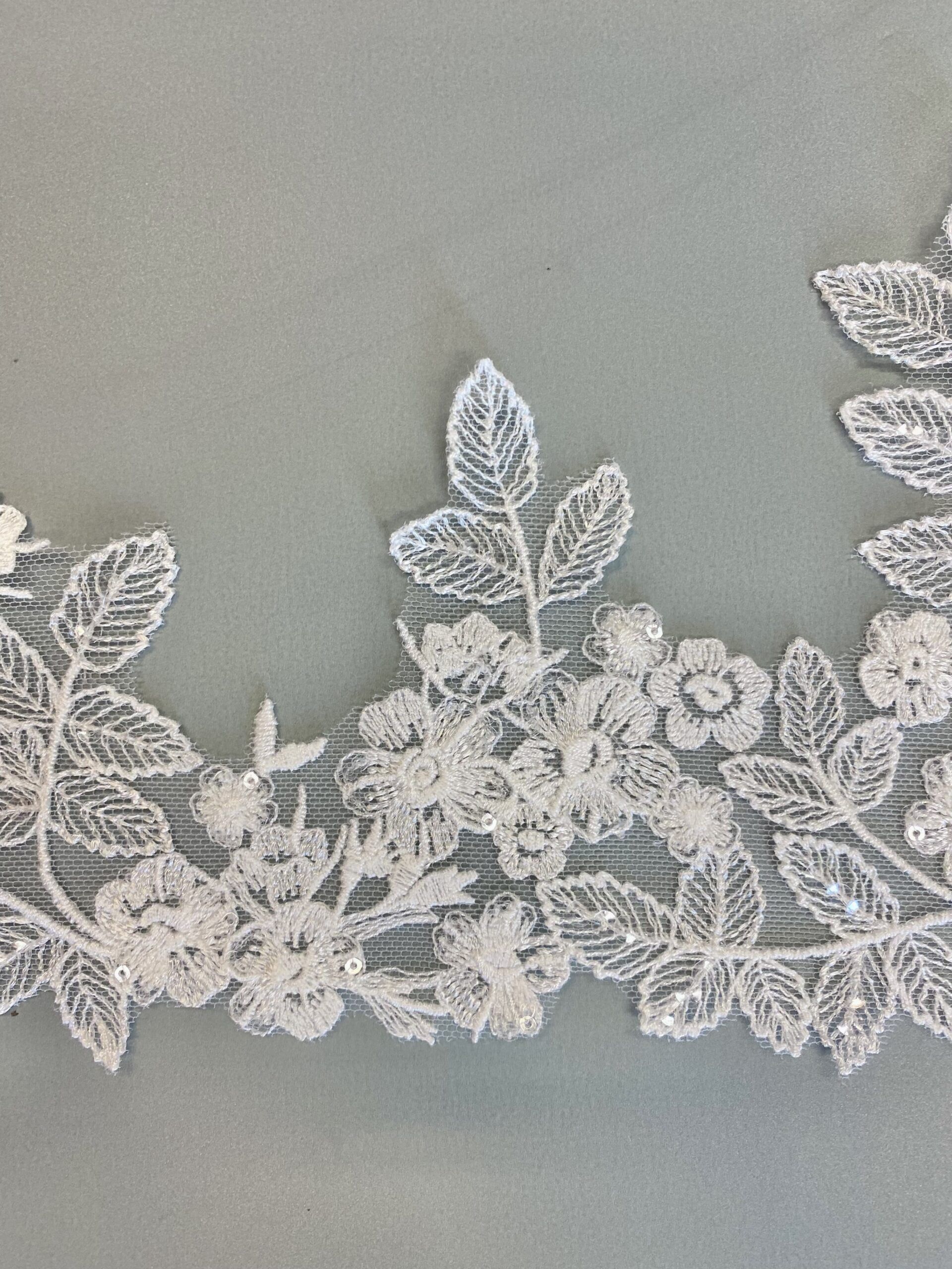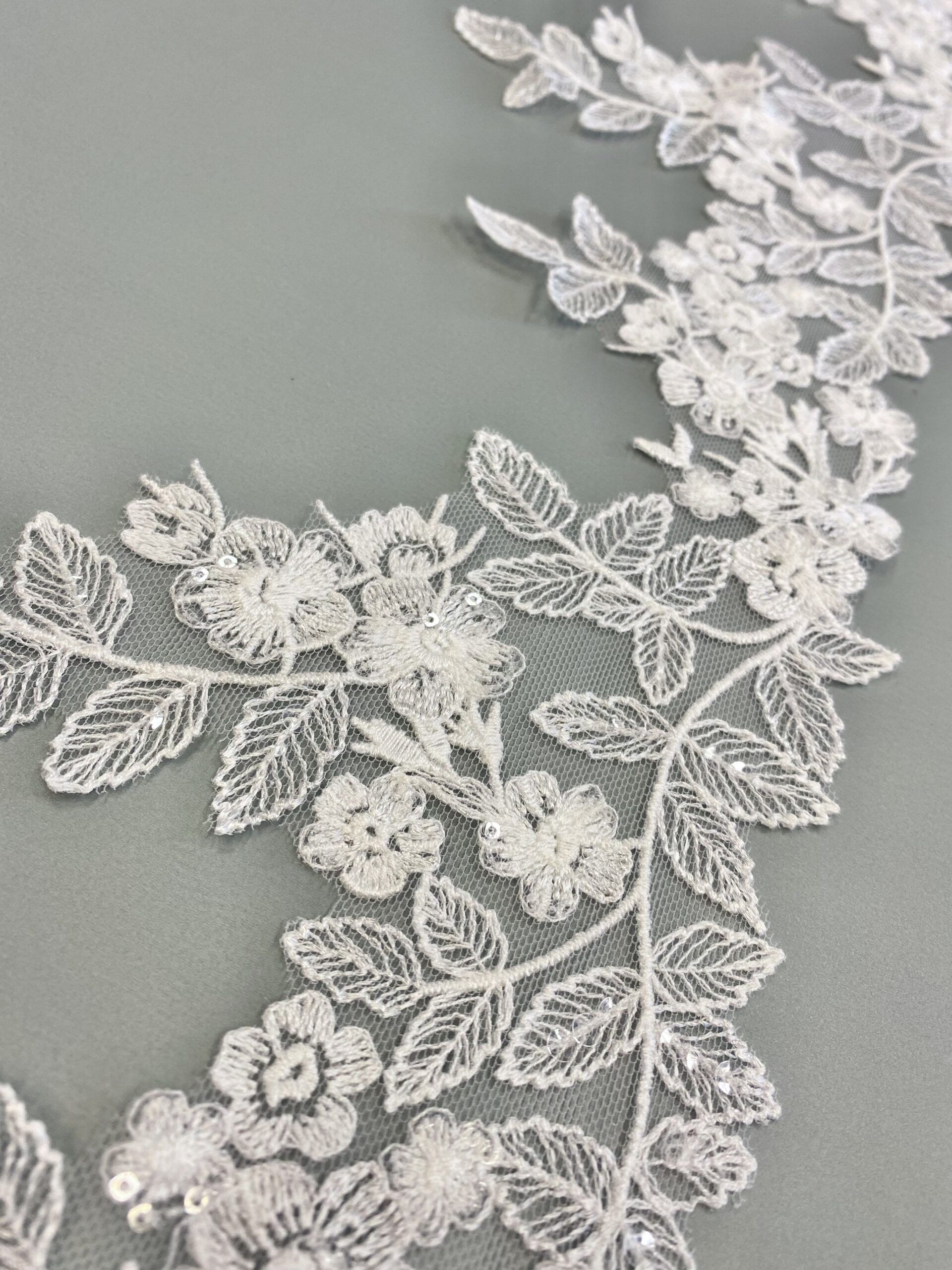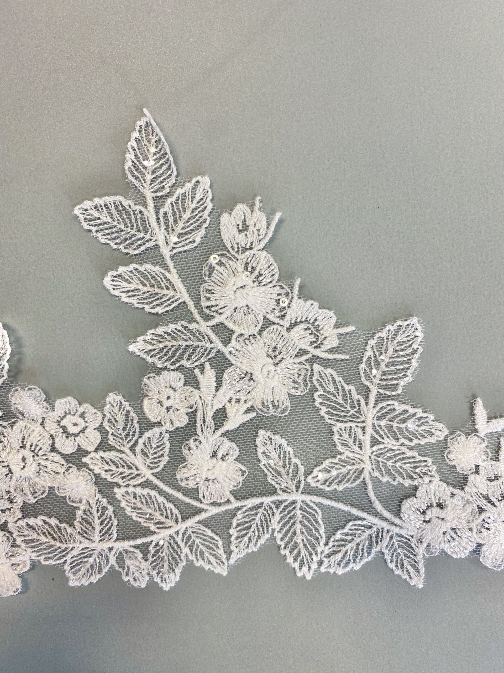A törtfehér csipkeszegő ideális kiegészítő menyasszonyi ruhák és fátylak finom lezárásához. A részletgazdag leveles motívum tüll alapra hímezve jelenik meg, finom áttetsző flitter díszítéssel, amely elegáns fényt ad a csipkének.
