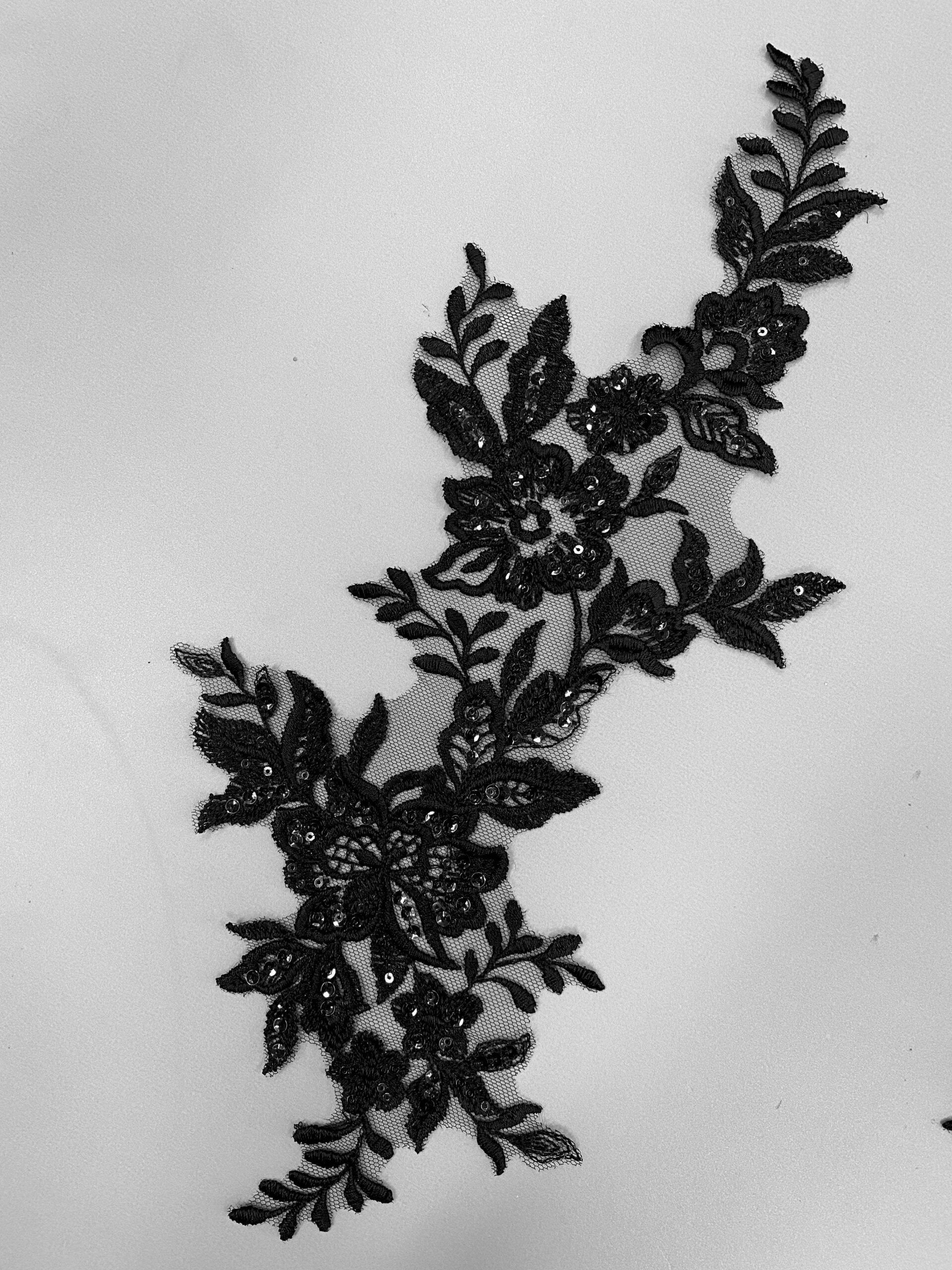 Fekete színű, tüll alapra hímzett páros csipke. Átlátszó flitterekkel díszítve.