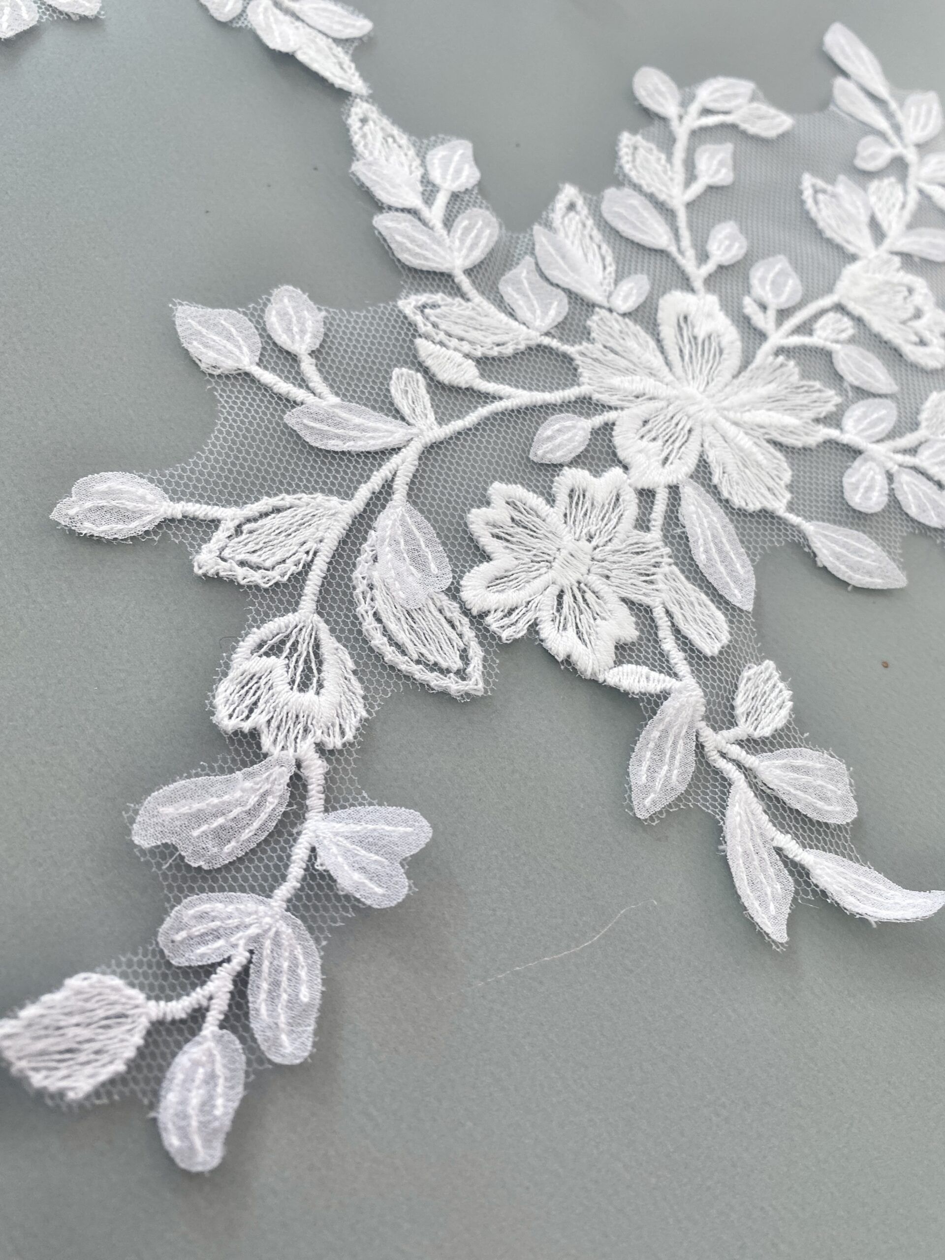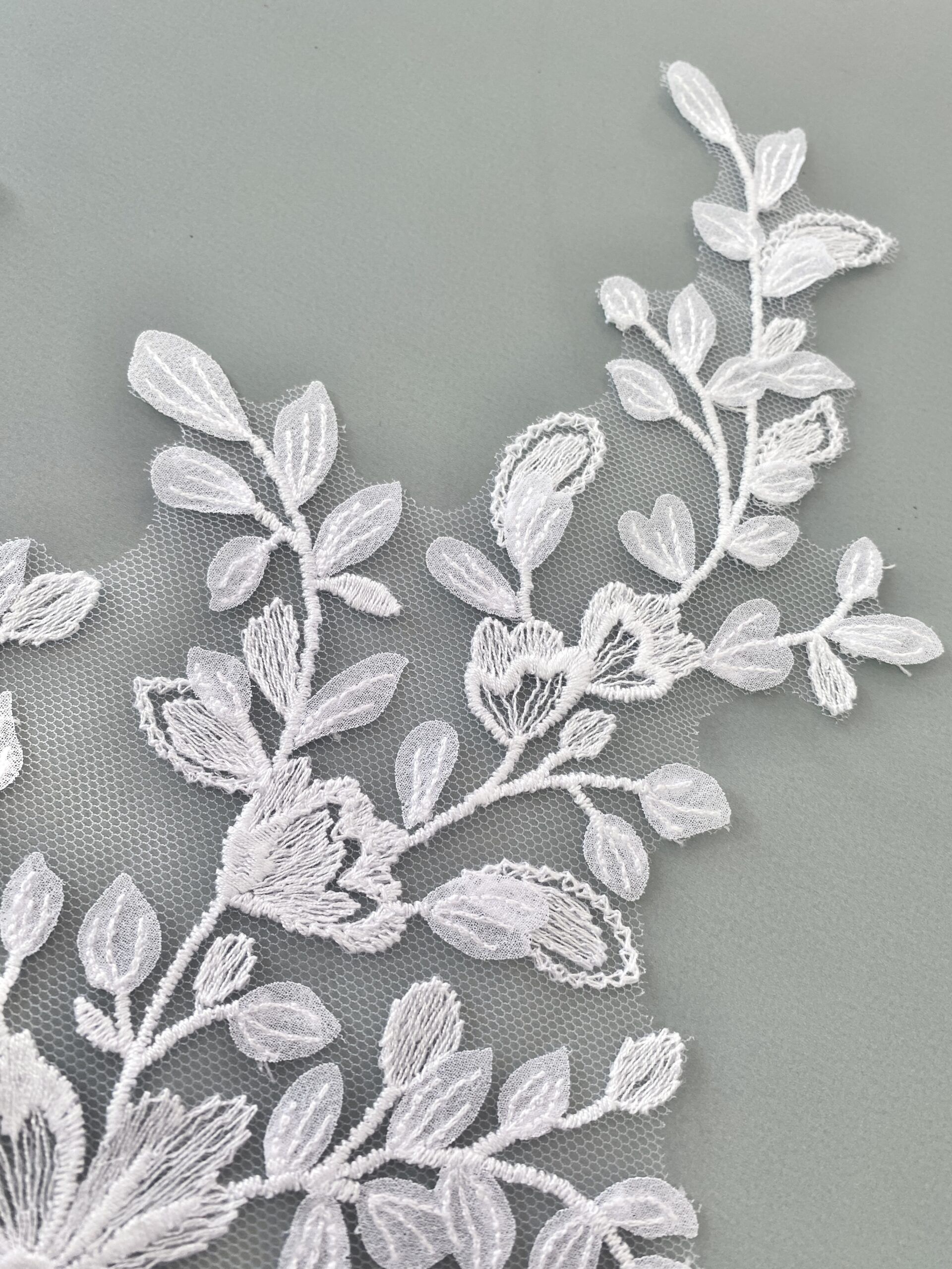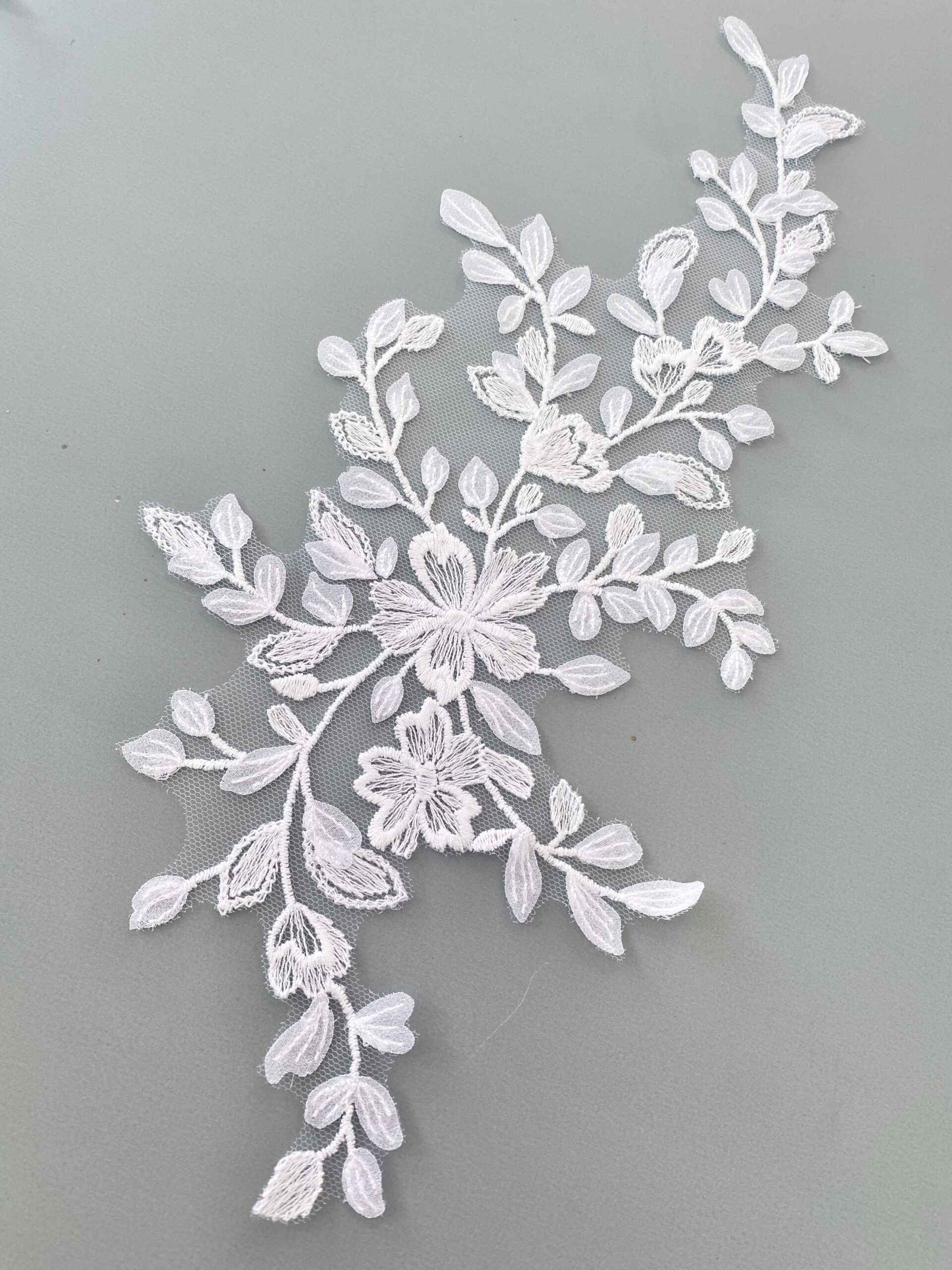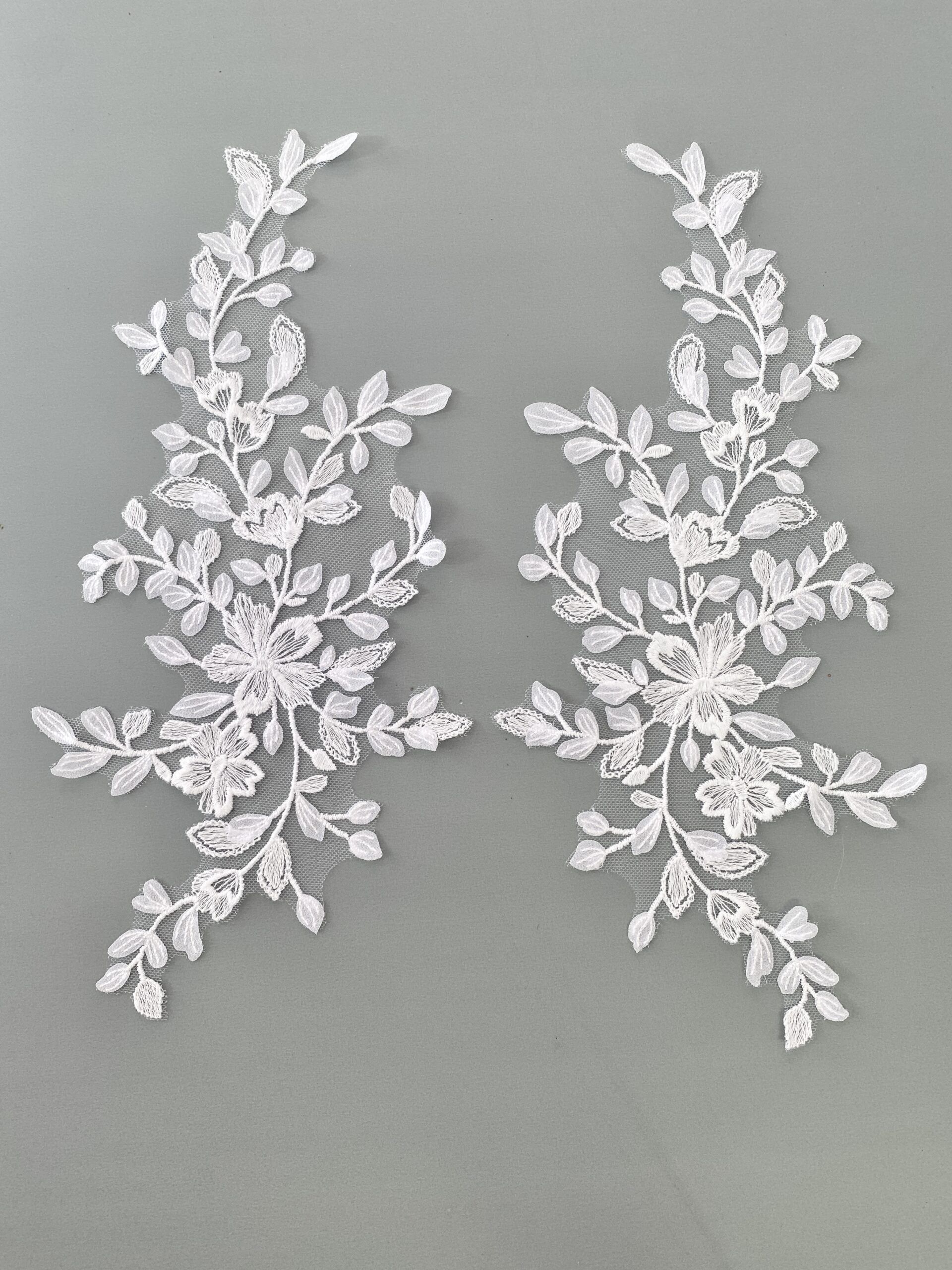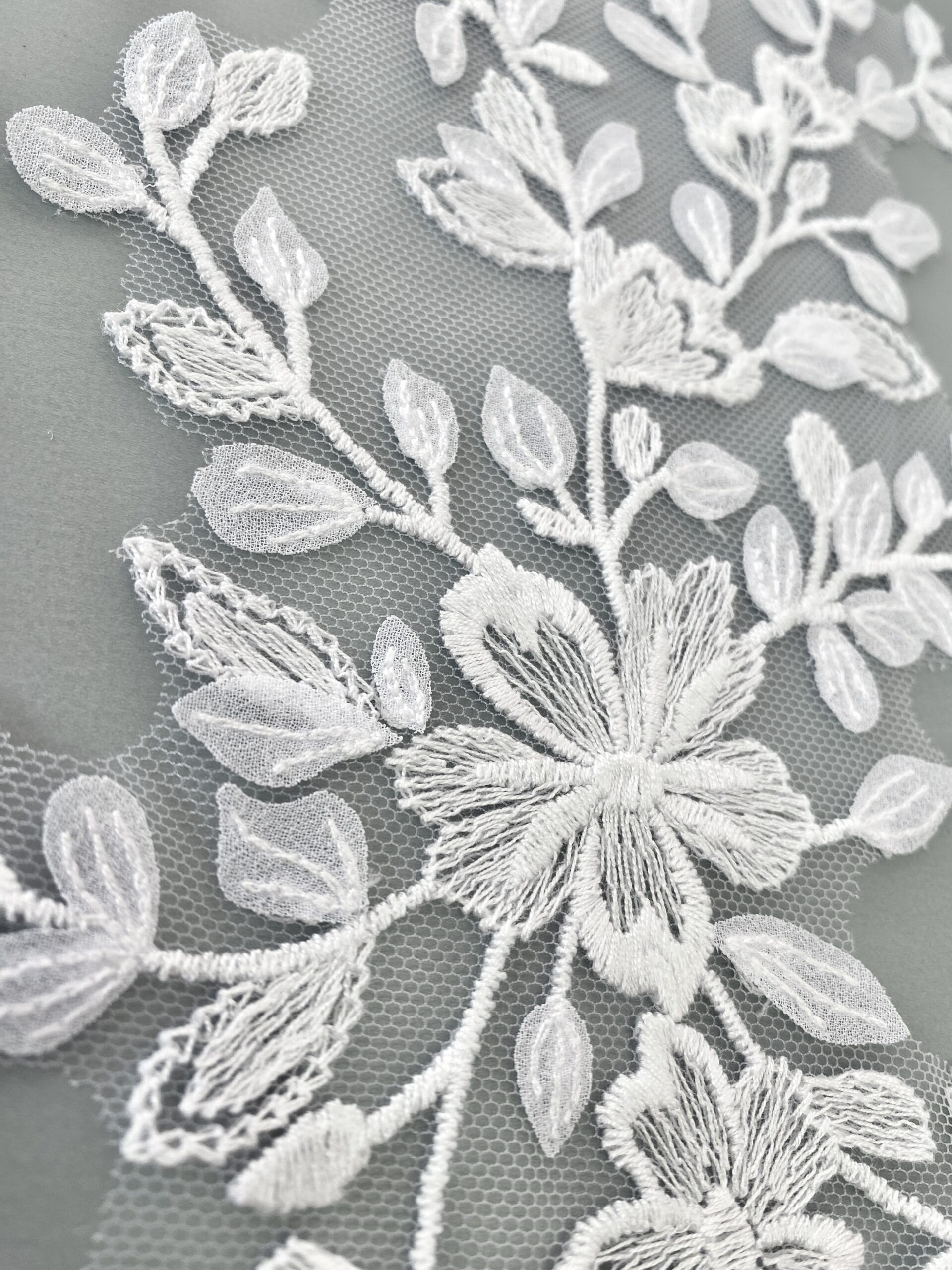 Fehér színű, tüll alapra hímzett páros csipke. Muszlin levelekkel díszítve.