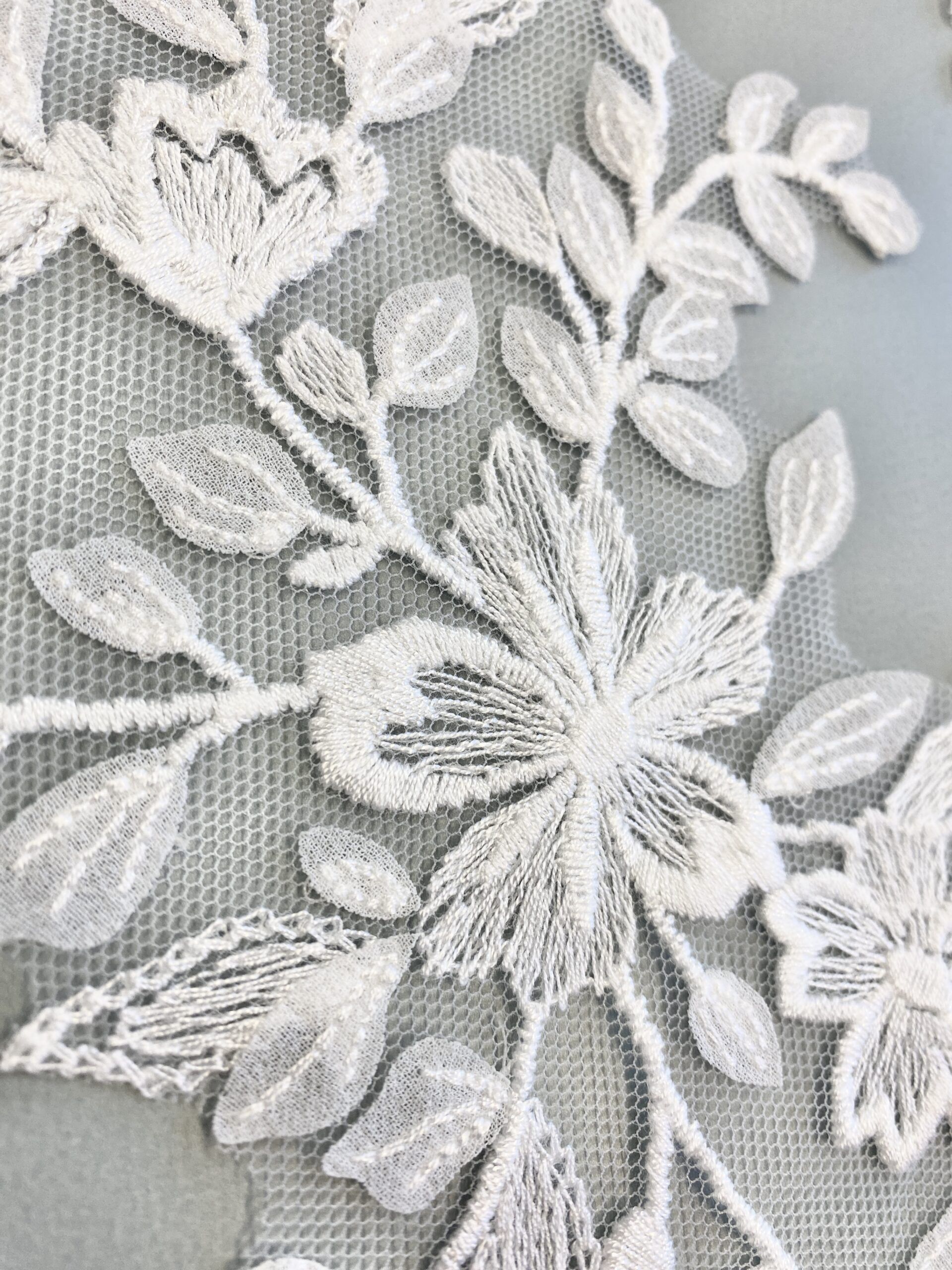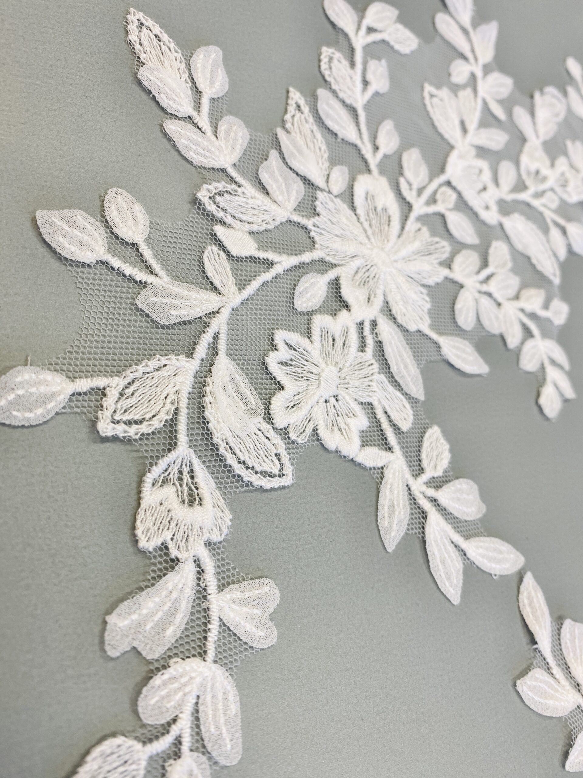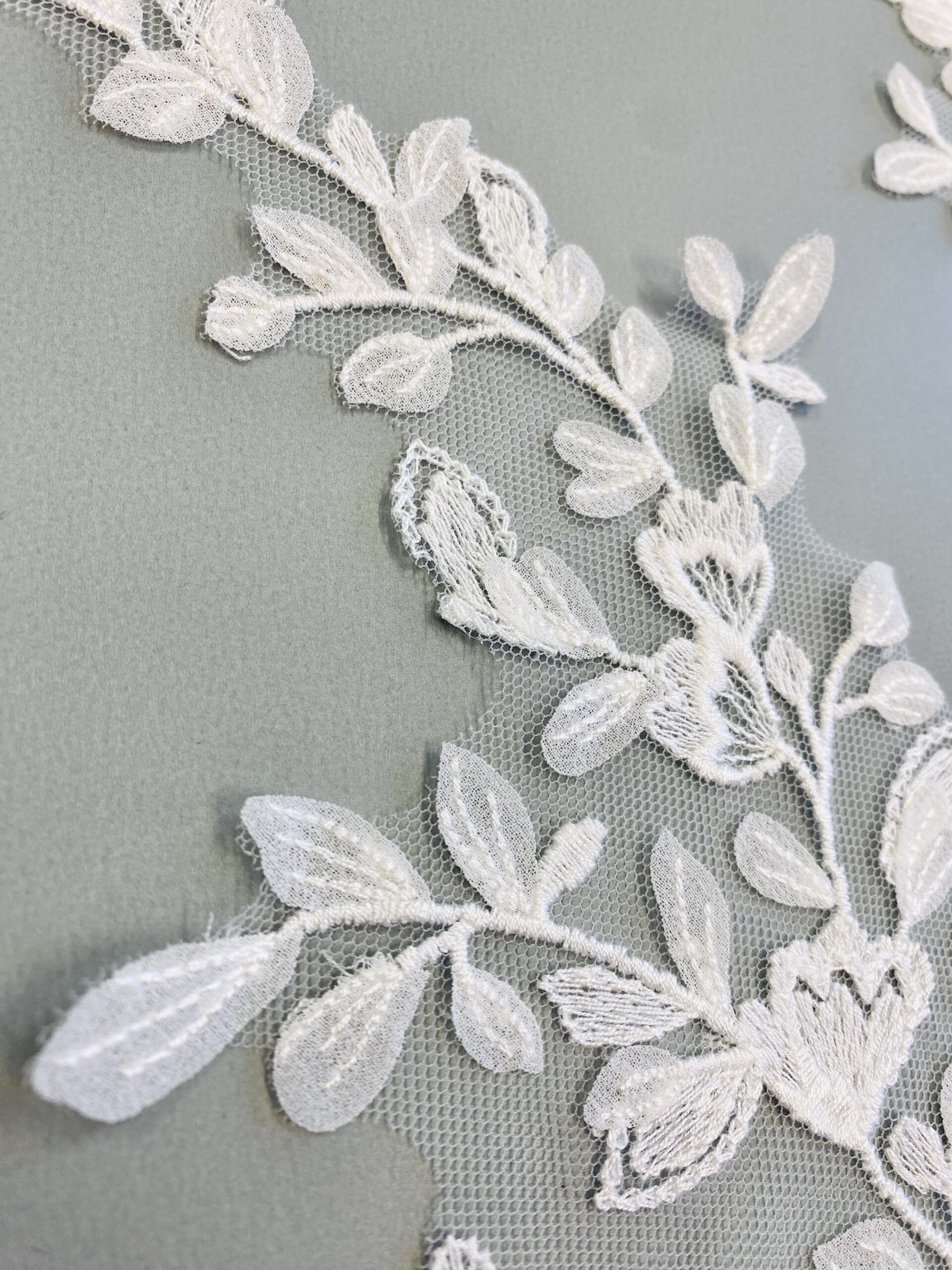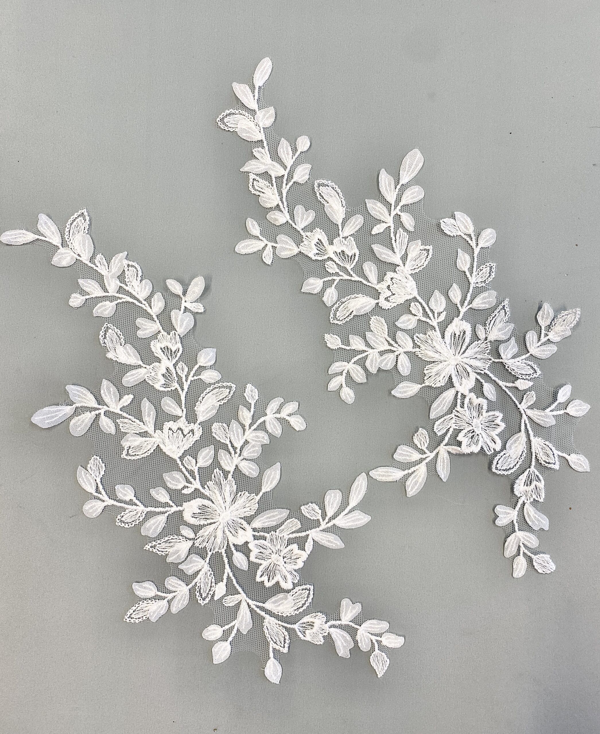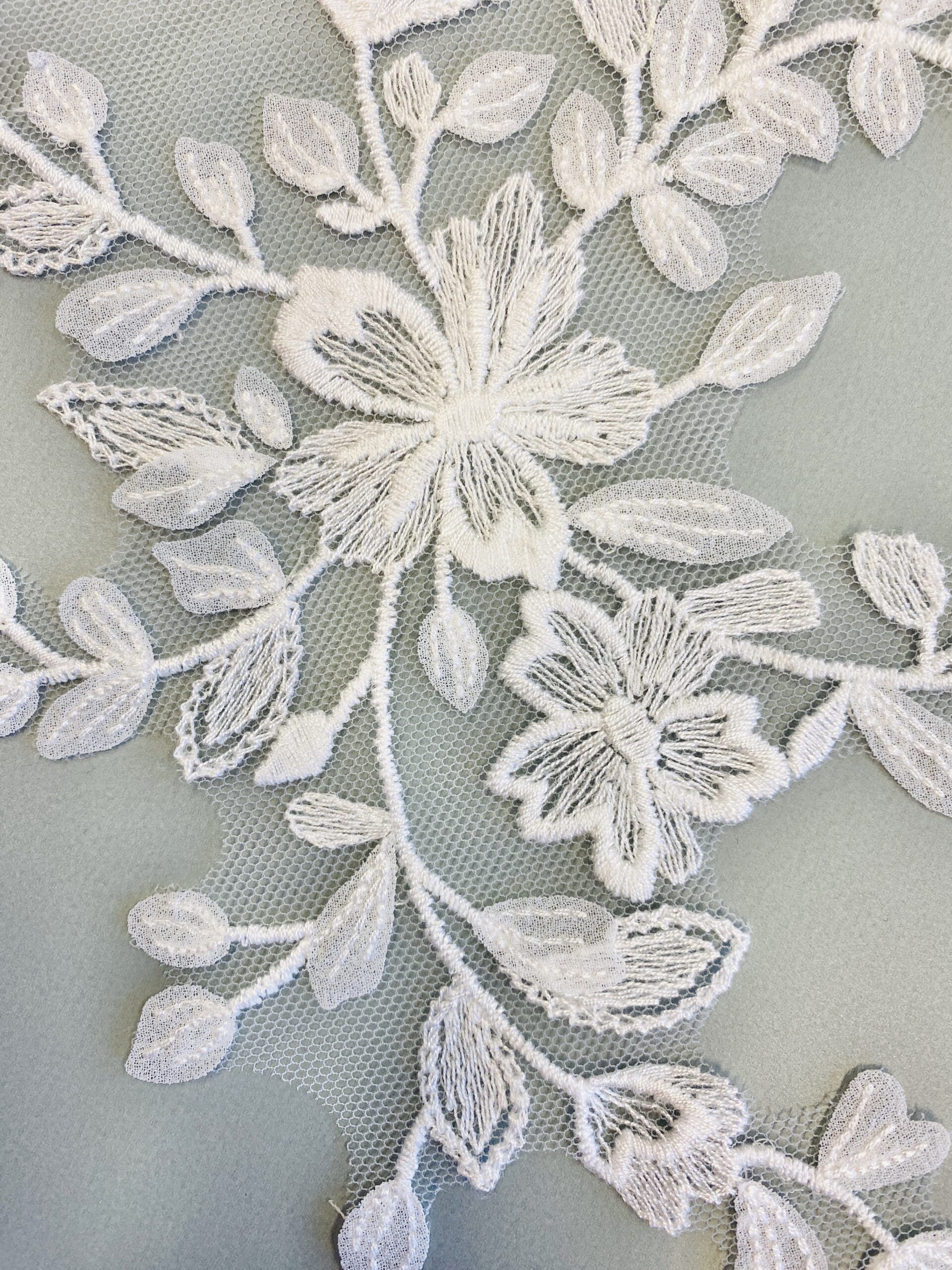 Törtfehér színű, tüll alapra hímzett páros csipke. Muszlin levelekkel díszítve.
