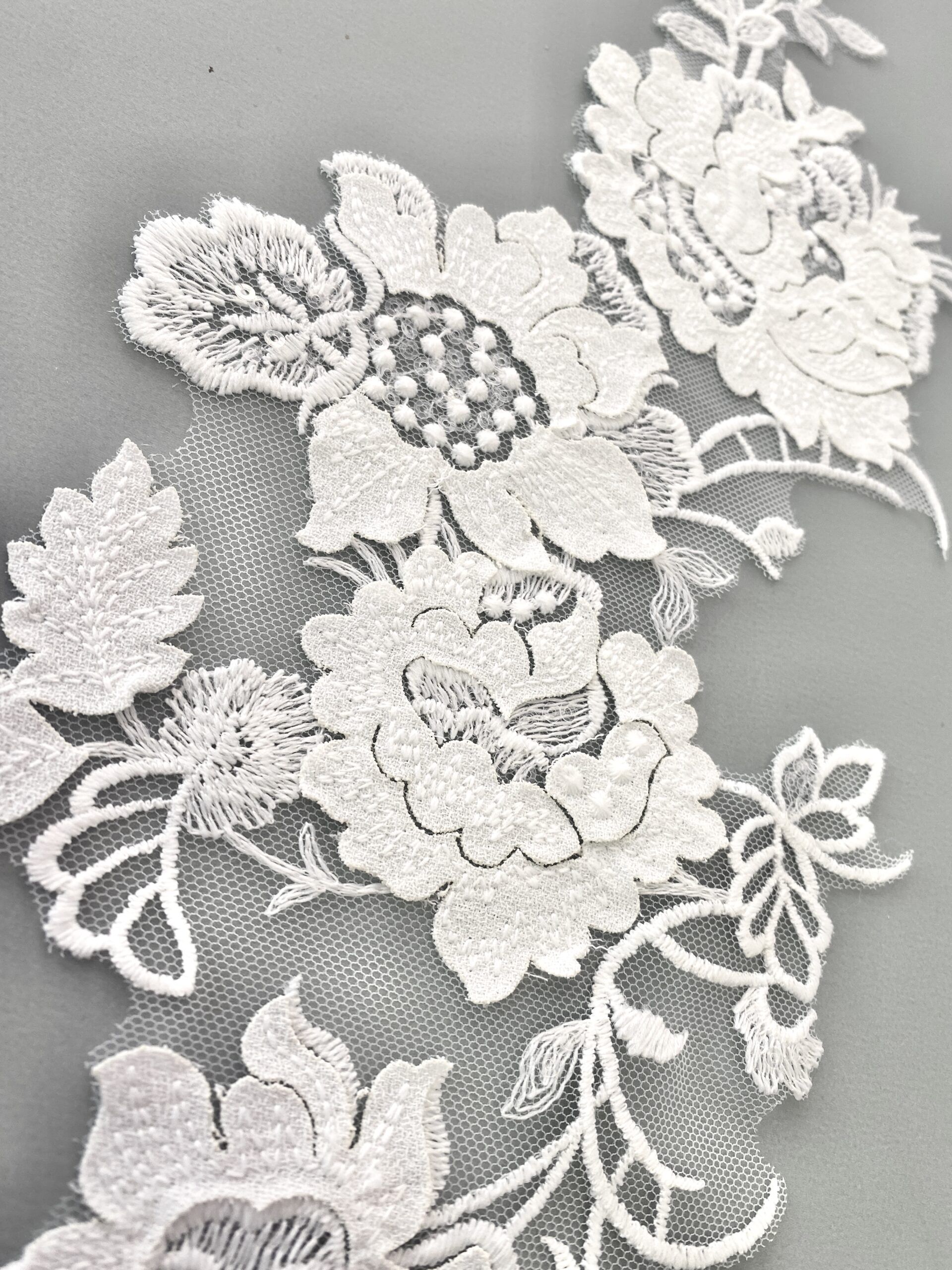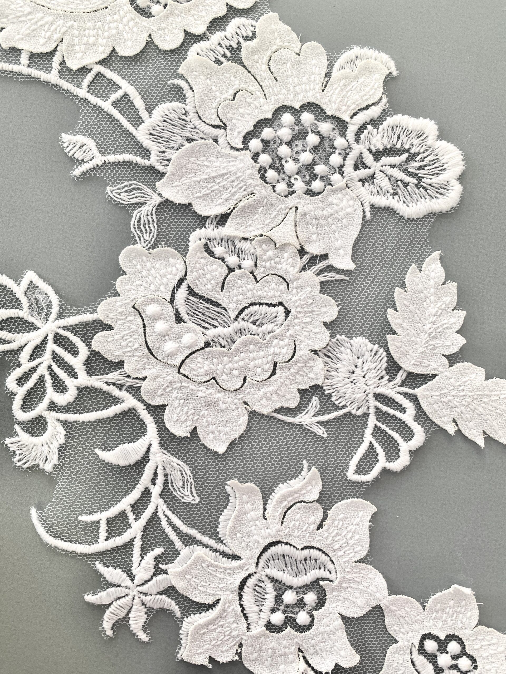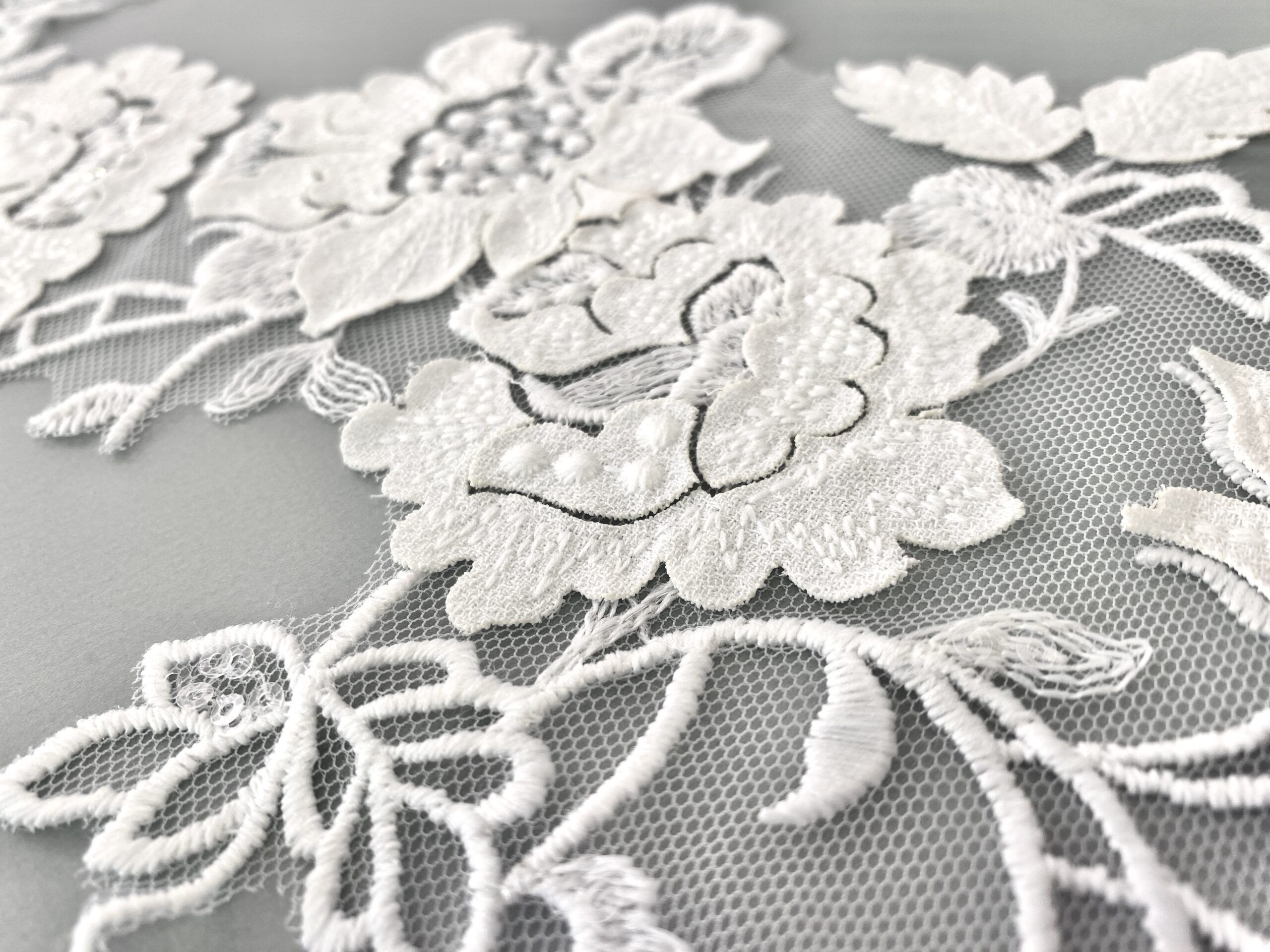 Ez a törtfehér páros csipke elegáns, lágy árnyalatával tökéletes választás vintage vagy romantikus esküvői ruhákhoz. A tüll alapra hímzett virágminta, a zsorzsett szirmok és az átlátszó flitterek együtt igazán gazdag, texturált felületet hoznak létre.
