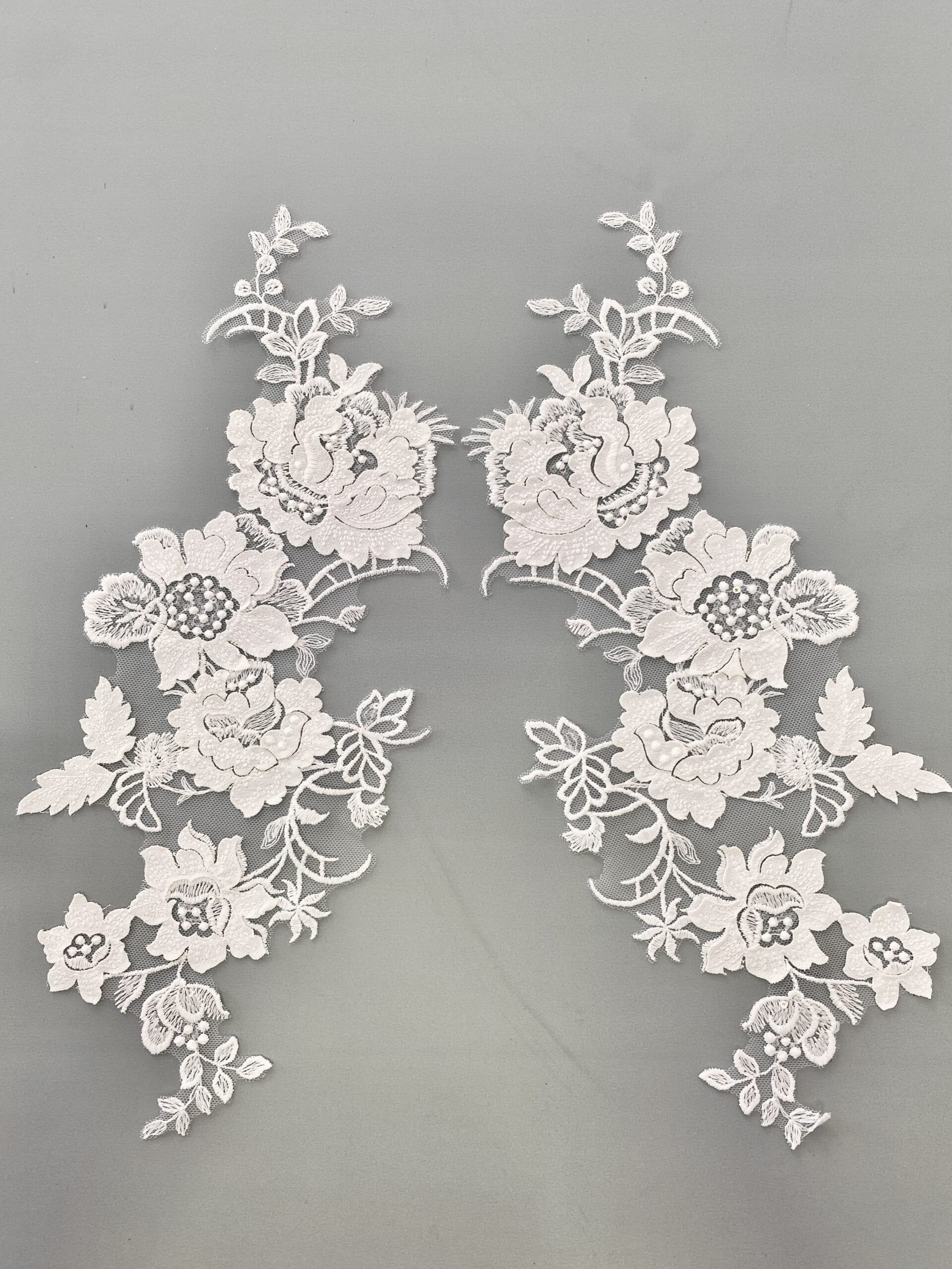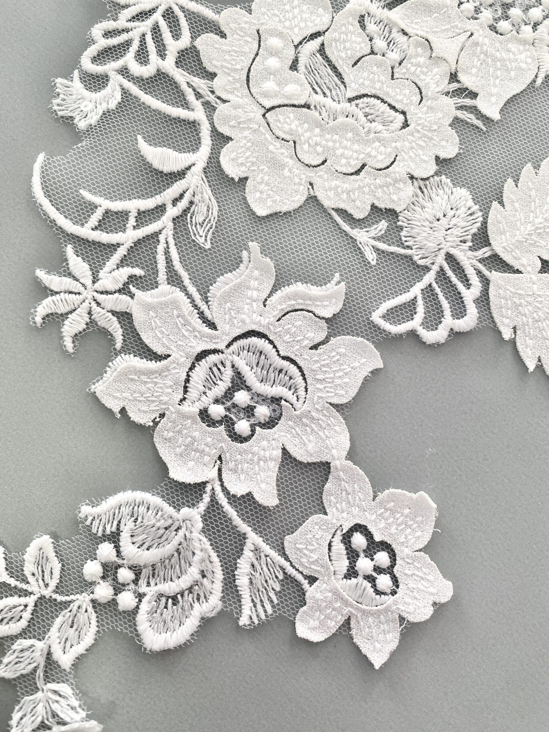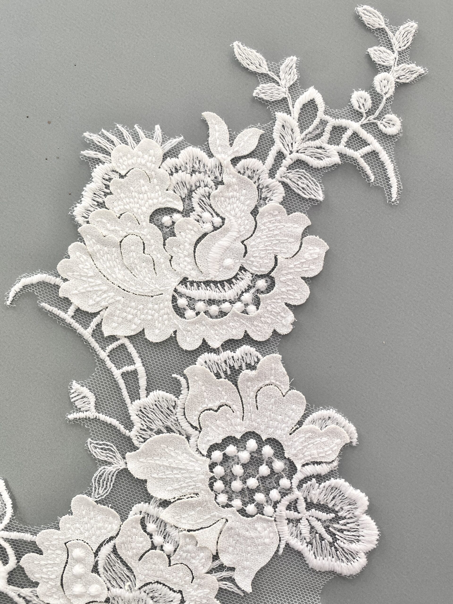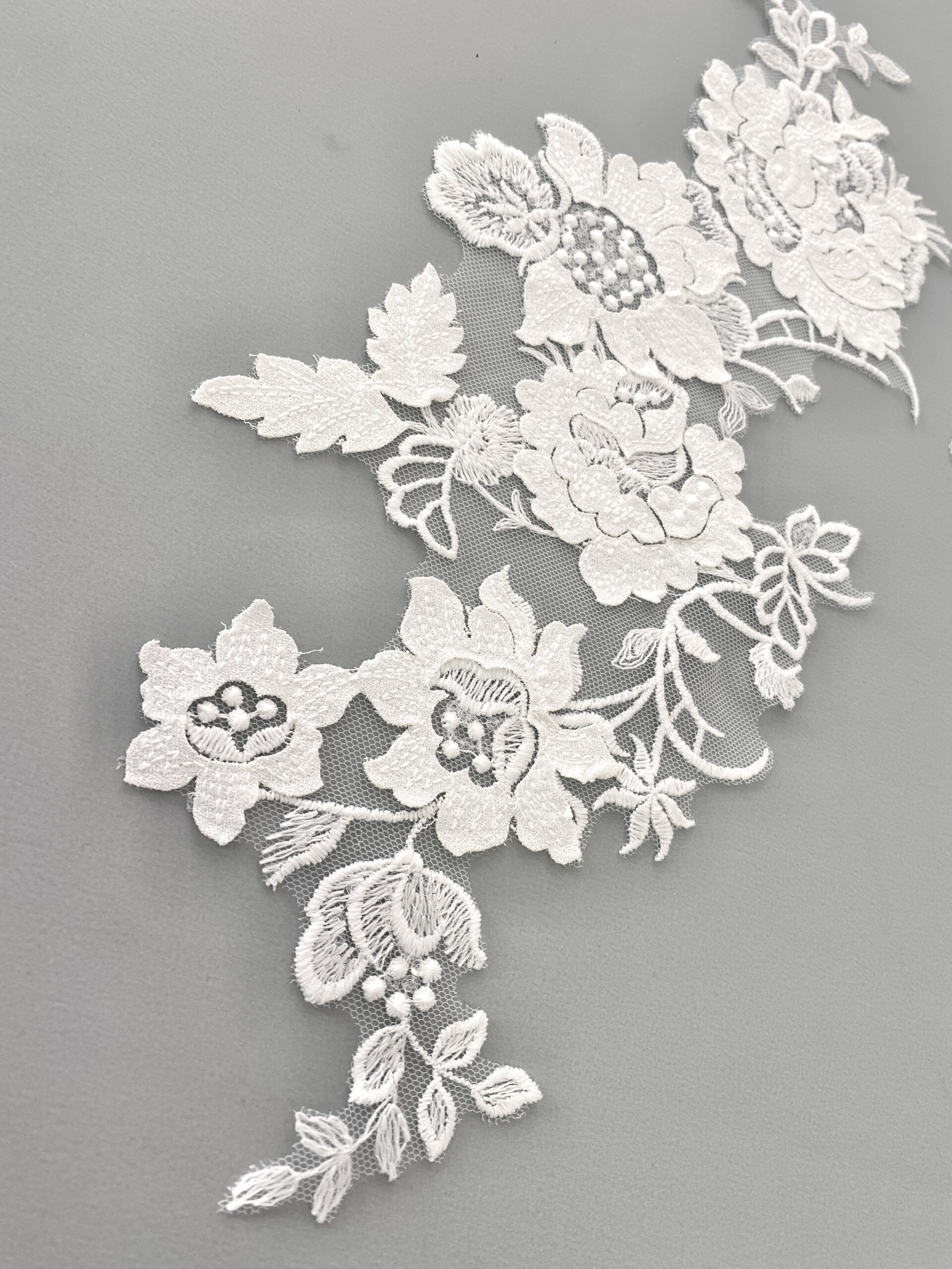 Ez a törtfehér páros csipke elegáns, lágy árnyalatával tökéletes választás vintage vagy romantikus esküvői ruhákhoz. A tüll alapra hímzett virágminta, a zsorzsett szirmok és az átlátszó flitterek együtt igazán gazdag, texturált felületet hoznak létre.