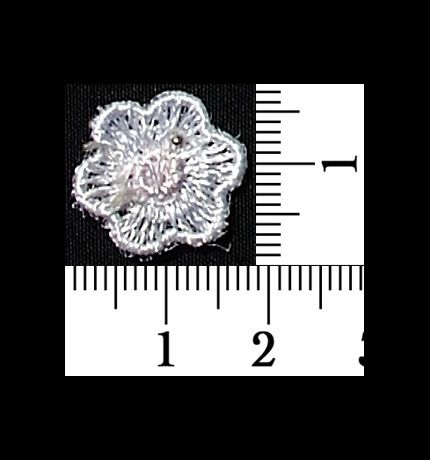 Fehér színű légcsipke virág, közepén lila színű hímzéssel.