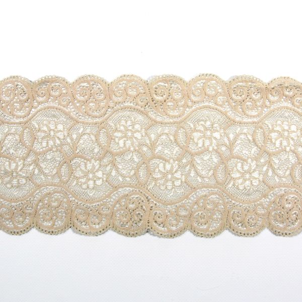 Pezsgő színű színű elasztikus csipke szegő. 14cm széles