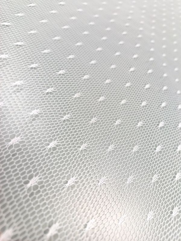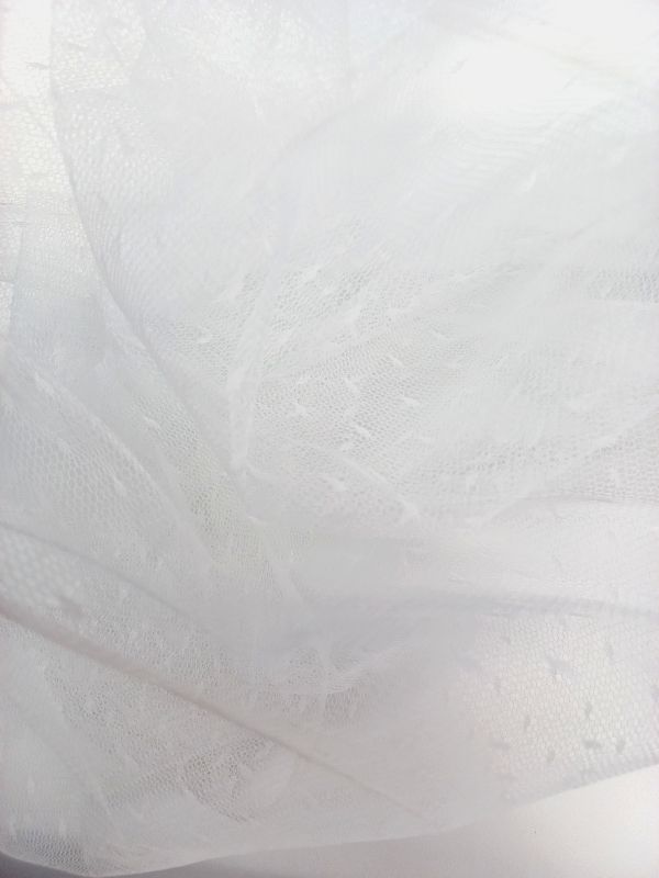 Fehér színű, 150 cm széles, anyagában pöttyös, jó tartású, közép tüll anyag.