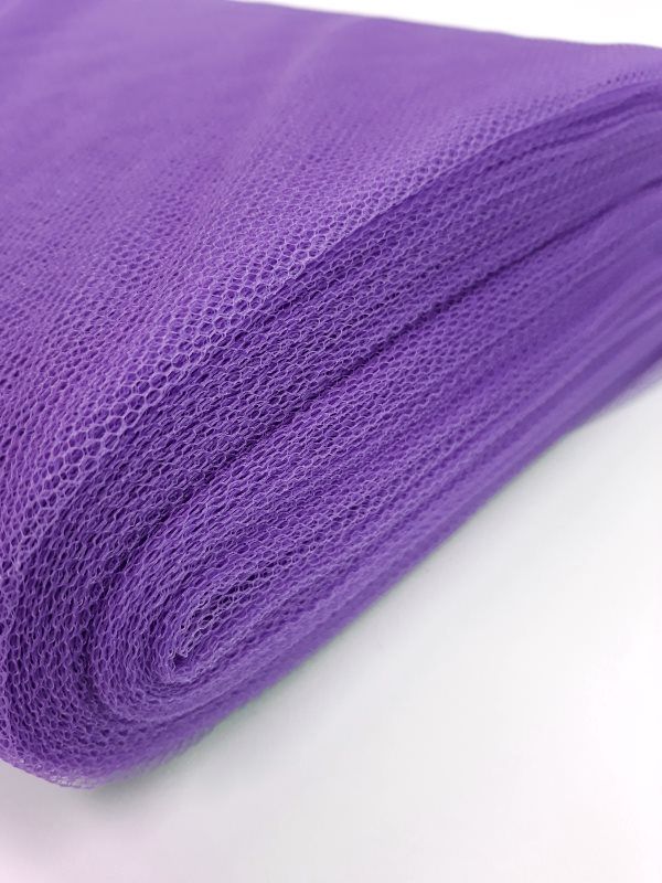 Lila színű középtüll. Közepes keménységű anyag. 150 cm széles.