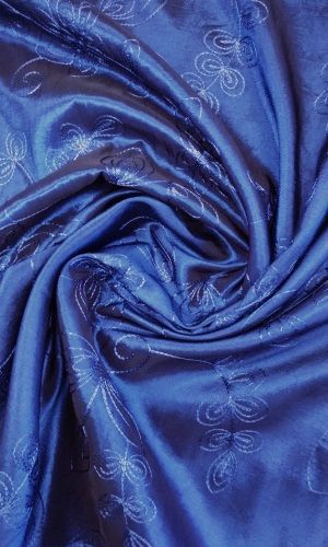 Kék színű, 150 cm széles, gyűrt, virágokkal himzett taft anyag.