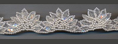 Fehér színű, szitára vart üveg alapú kásagyöngyökből, irizáló flitterekből készült kézzel varrott dísz.