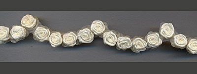 Krém színű, szitára vart, szatén rózsákból készült, kézzel varrott dísz.