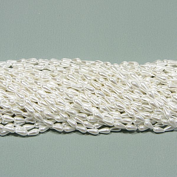 Fehér színű, 4x8mm nagyságú, csepp alakú, üveg alapú japán gyöngy. Hagyományos tűvel varrható, kiváló minőségű gyöngy. (1szál körül-belül 92 db-ot tartalmaz)