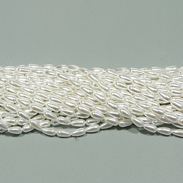 Fehér színű, 5x10mm nagyságú, csepp alakú, üveg alapú japán gyöngy. Hagyományos tűvel varrható, kiváló minőségű gyöngy. (1szál körül-belül 77 db-ot tartalmaz)