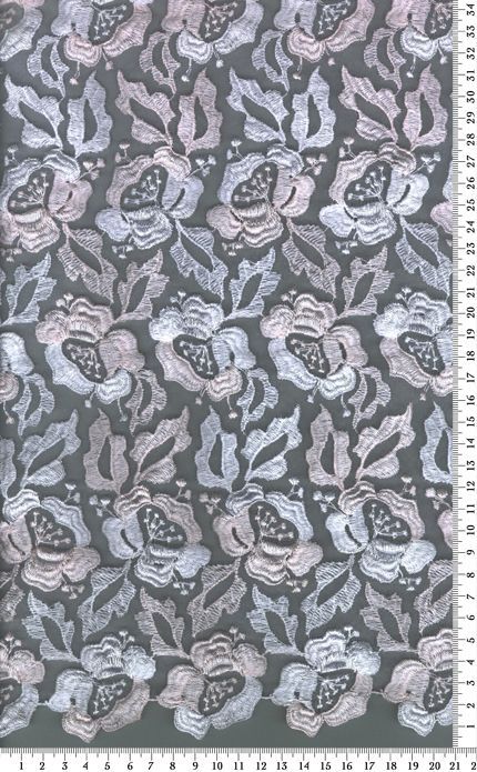 Fehér és barack organza alapon, hímzett csipke anyag. Szélesség 130 cm