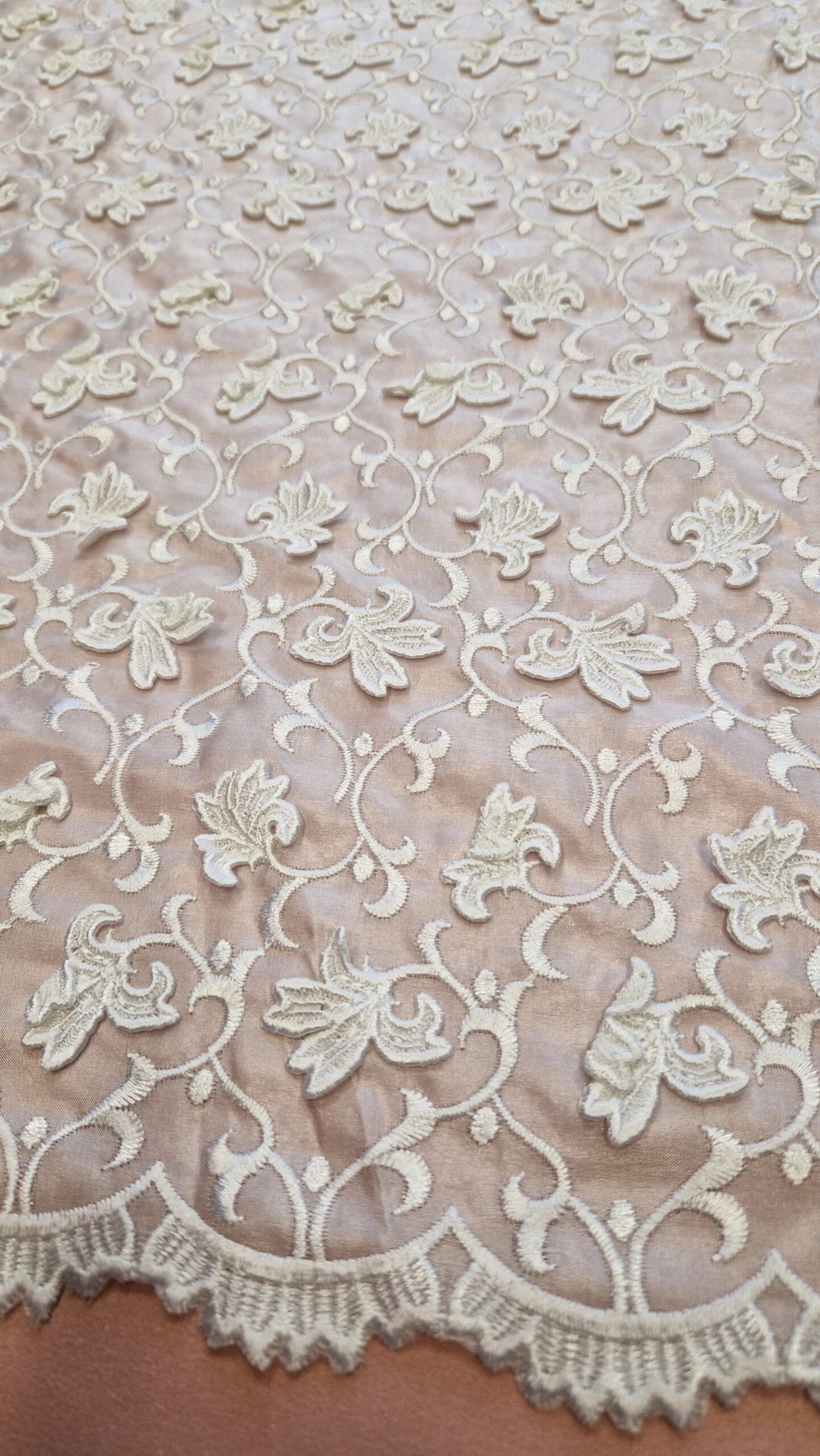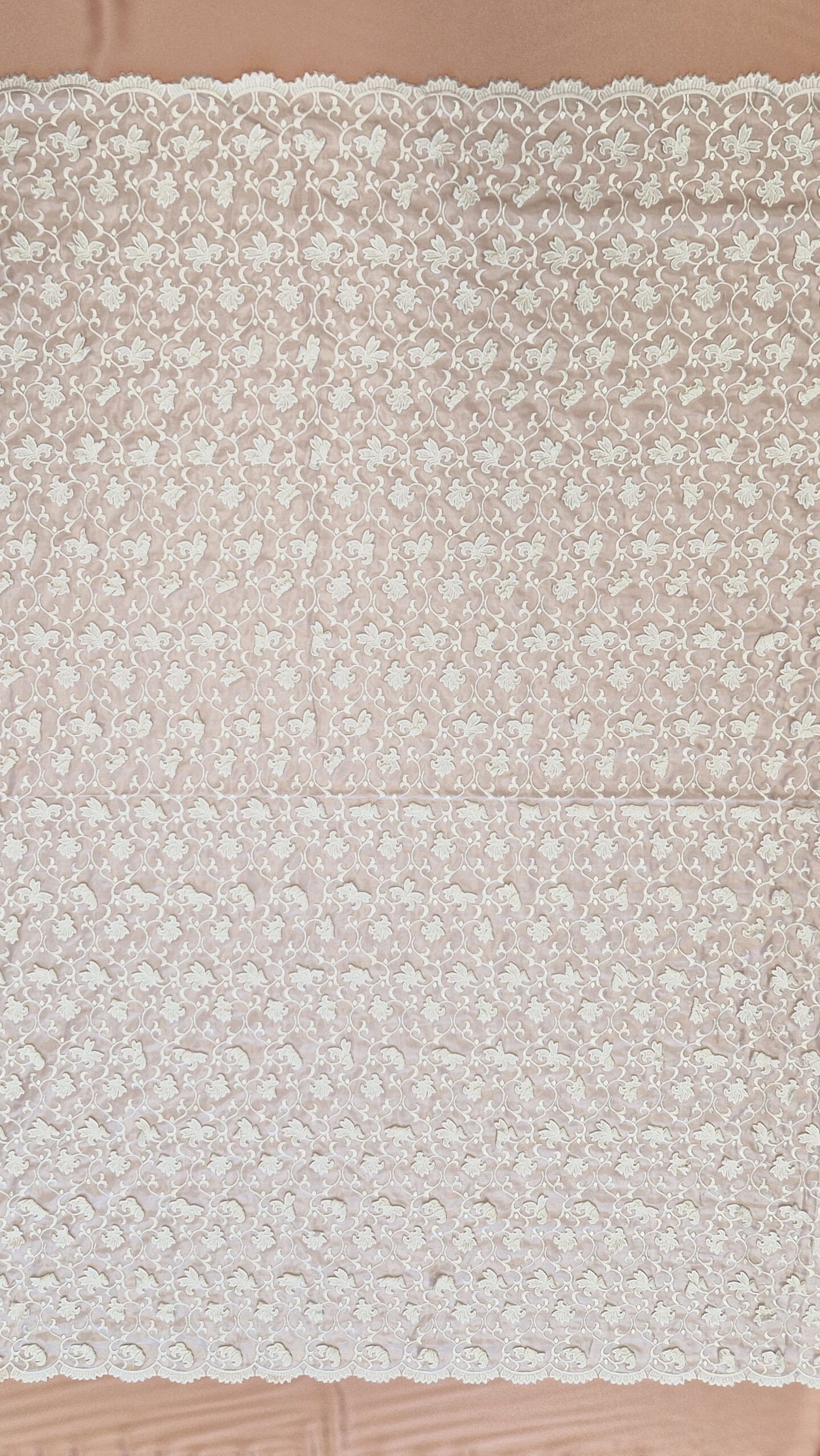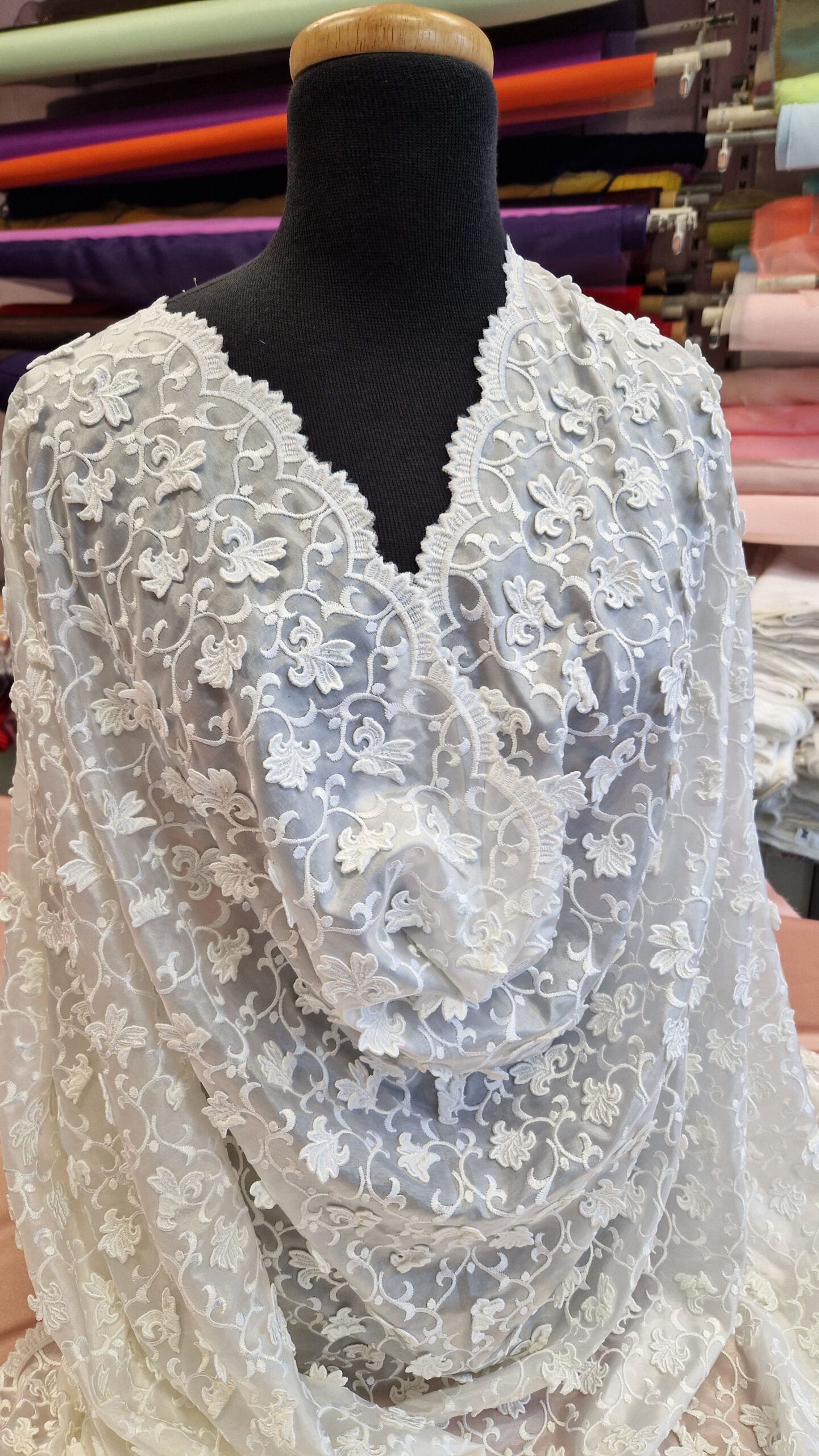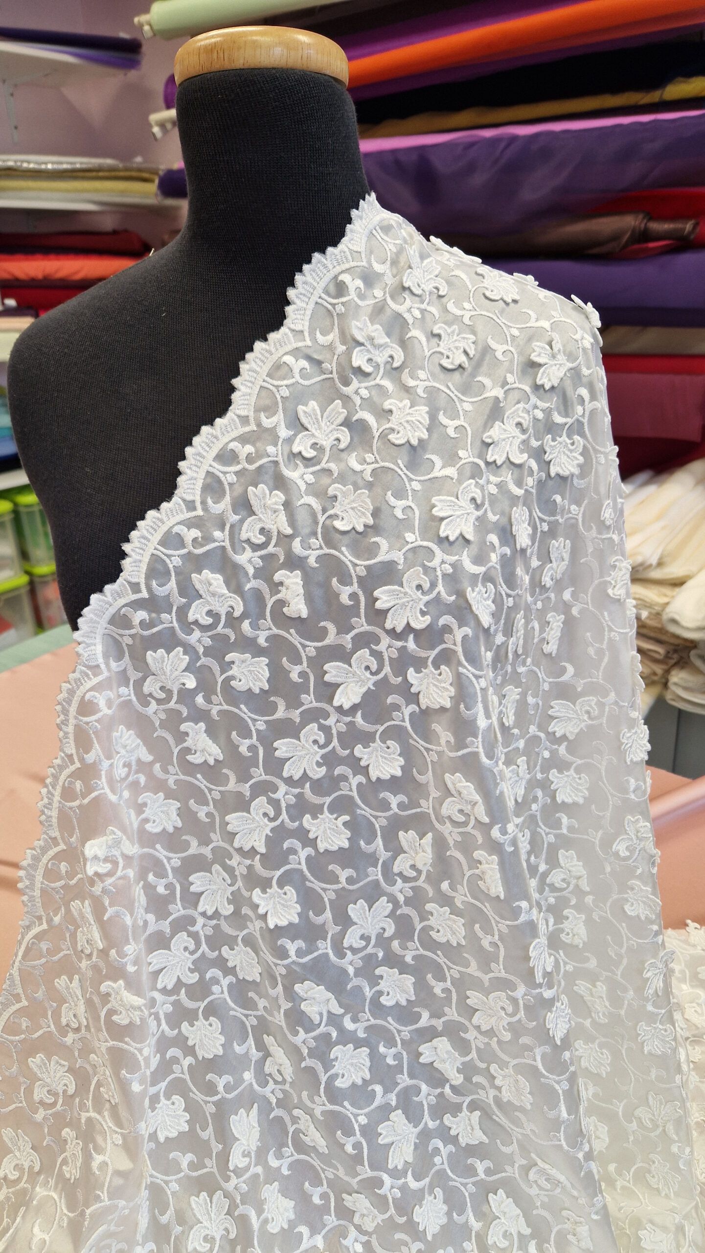 Ez a különleges, 3D hatású csipkeanyag finoman áttetsző organza alapra készült, gazdagon, teljes felületén hímzett mintával. A motívumok enyhén kiemelkednek az alapból, így elegáns térbeli hatást adnak, amely különösen jól érvényesül esküvői ruhákon.