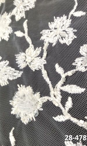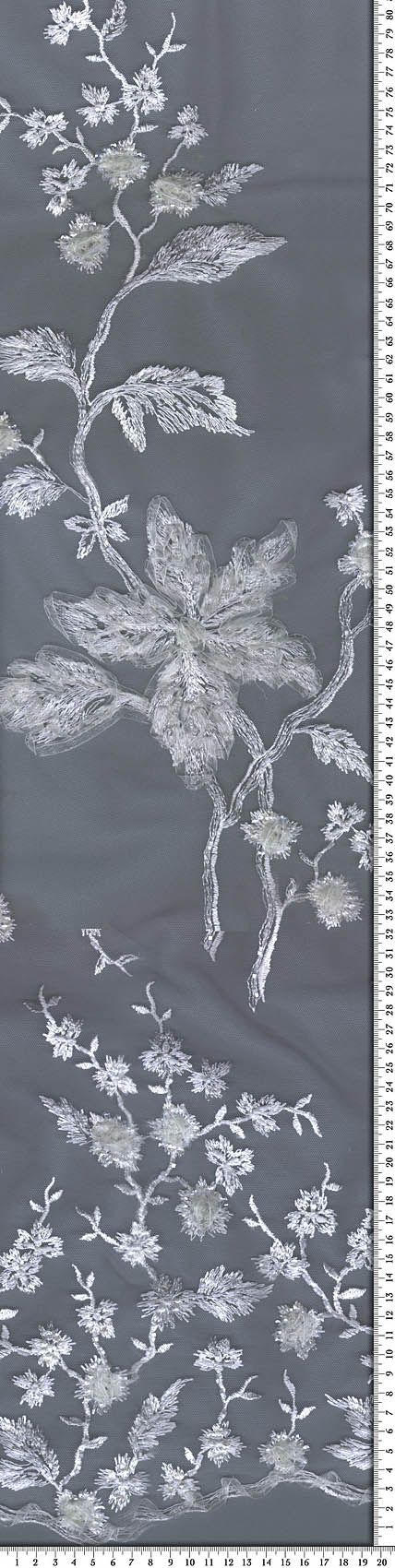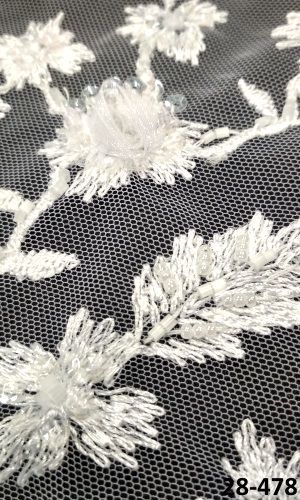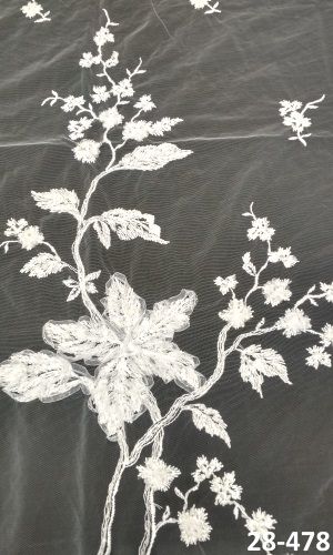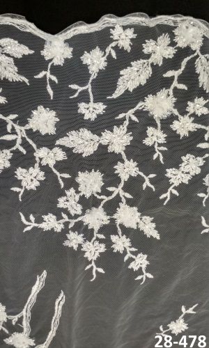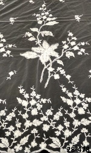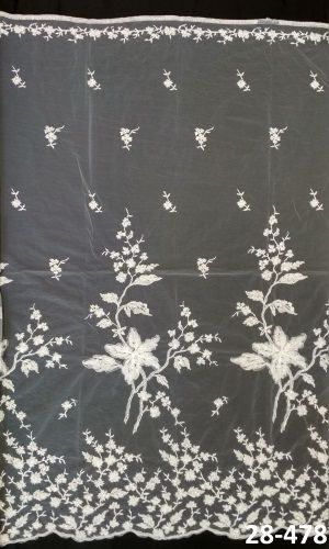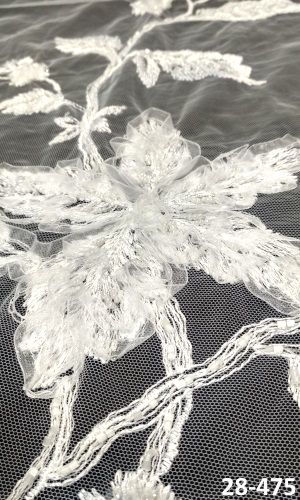 Fehér Tüll alapon, hímzett, fliterekkel és organzával díszitett csipke anyag. Szélessége: 130 cm. Egy bordűrös.
