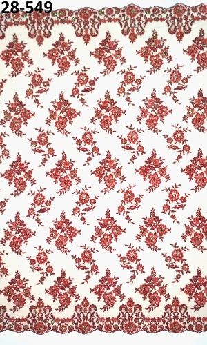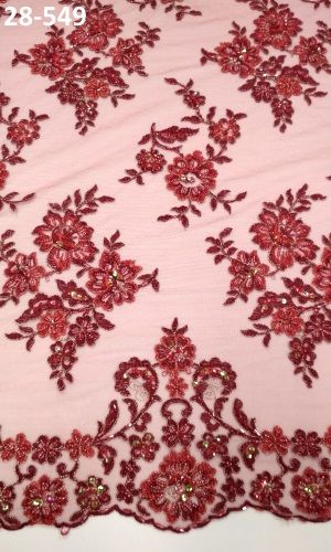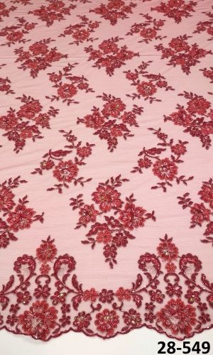 Meggypiros tüll alapon, hímzett, gyönggyel, flitterrel díszítve, 130 cm széles. Két bordűrös.