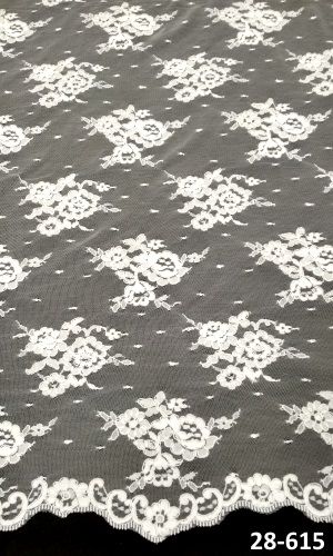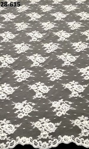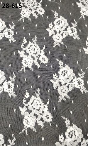 A 28-615 cikkszámú fehér rachel (francia) csipkeanyag elegáns és nőies megjelenést kölcsönöz minden alkalmi vagy esküvői ruhának. A pöttyös hatású alapra telibe hímzett, sűrű kis virágcsokor minta kerül, amely gazdag, mégis finom összhatást ad az anyagnak.