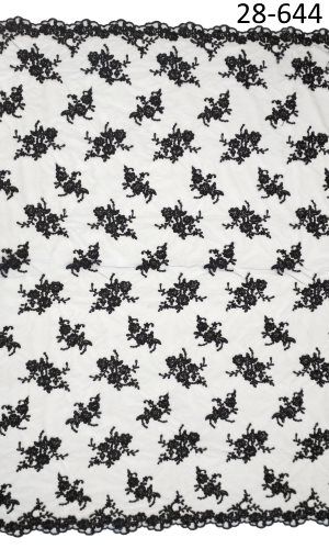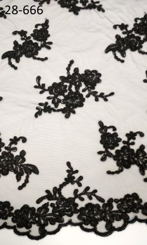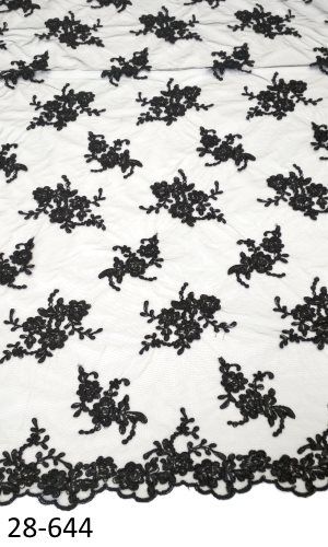 A fekete zsinórozott csipkeanyag klasszikus eleganciát és textúrában gazdag megjelenést kínál. A finoman kidolgozott csipke struktúrája virág mintákból áll, amelyeket zsinórozott részletek tesznek karakteressé. A mély fekete szín erőteljes, mégis letisztult megjelenést biztosít, ami akár alkalmi ruhák, esküvői díszítések vagy dekoratív ruharészek fő alapanyagaként is megállja a helyét.