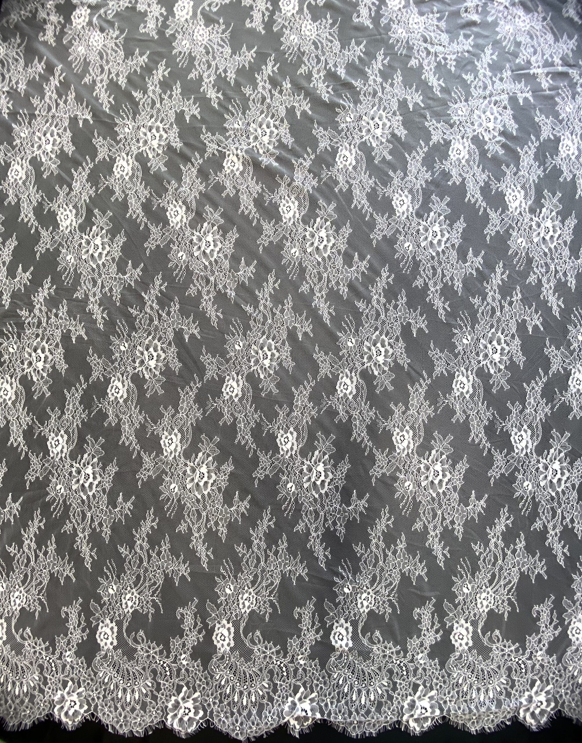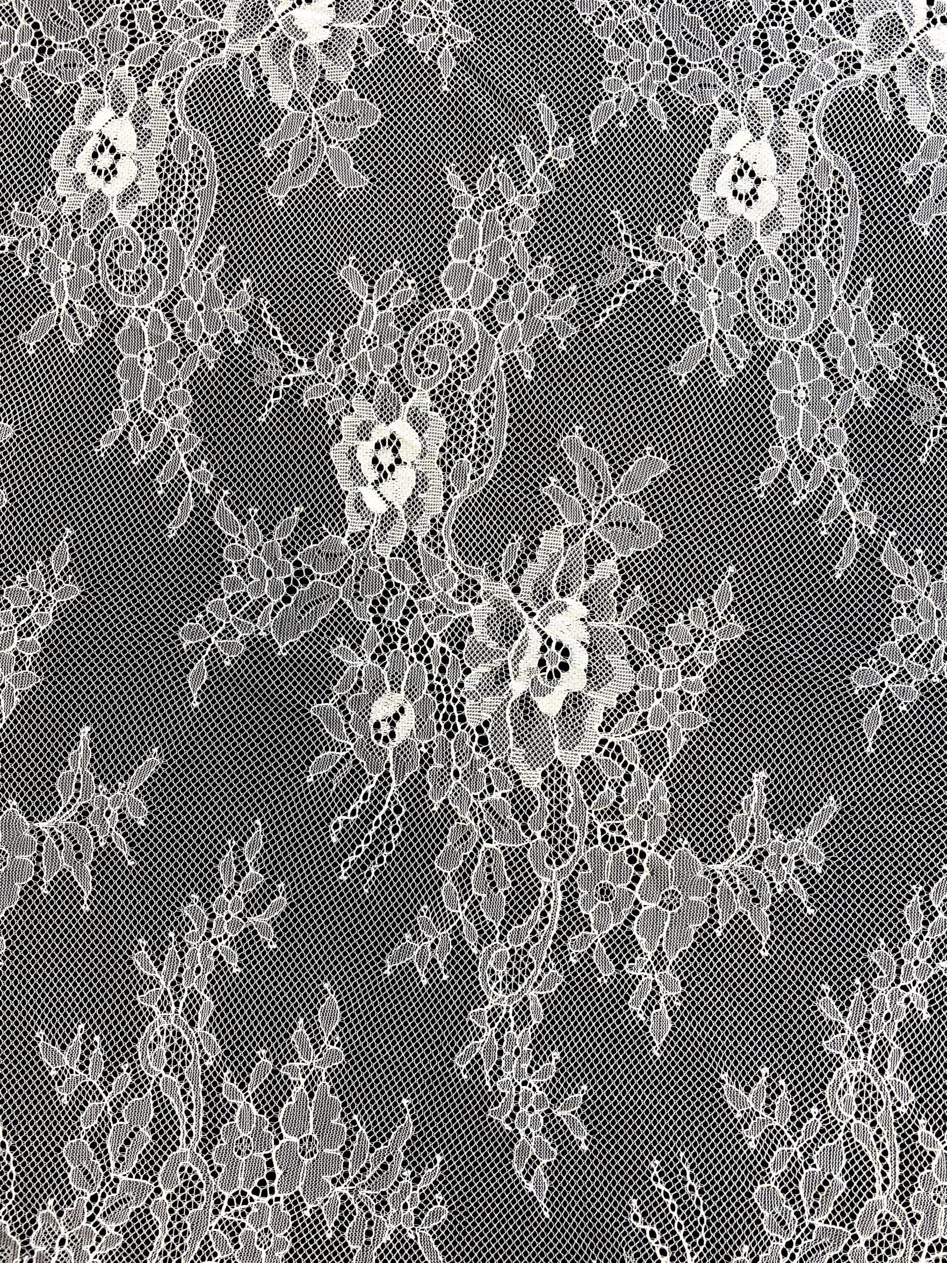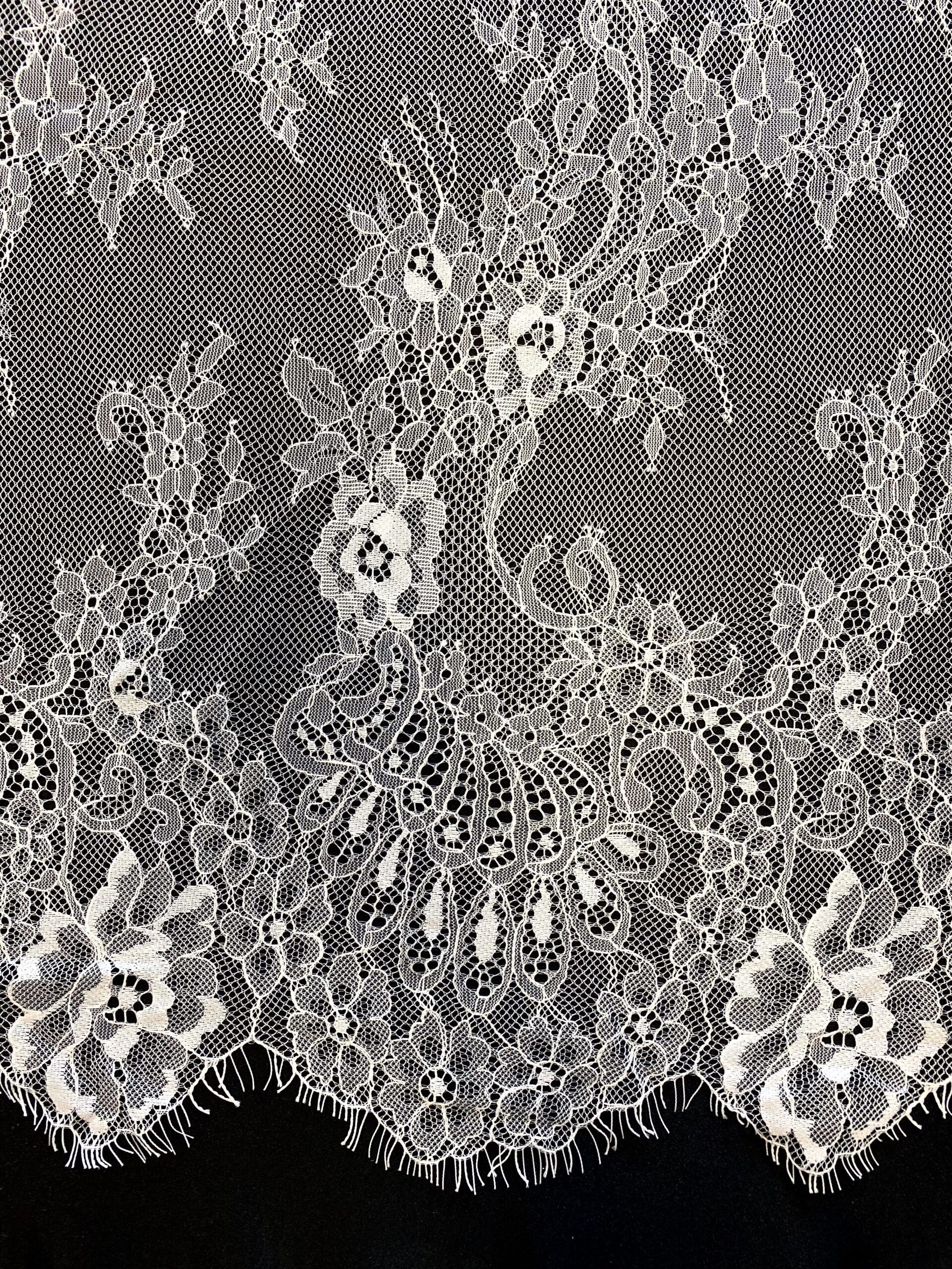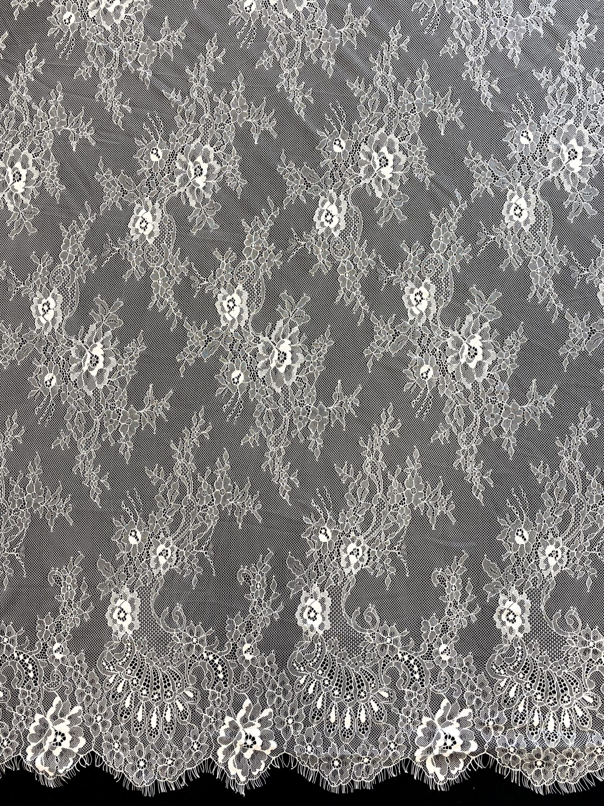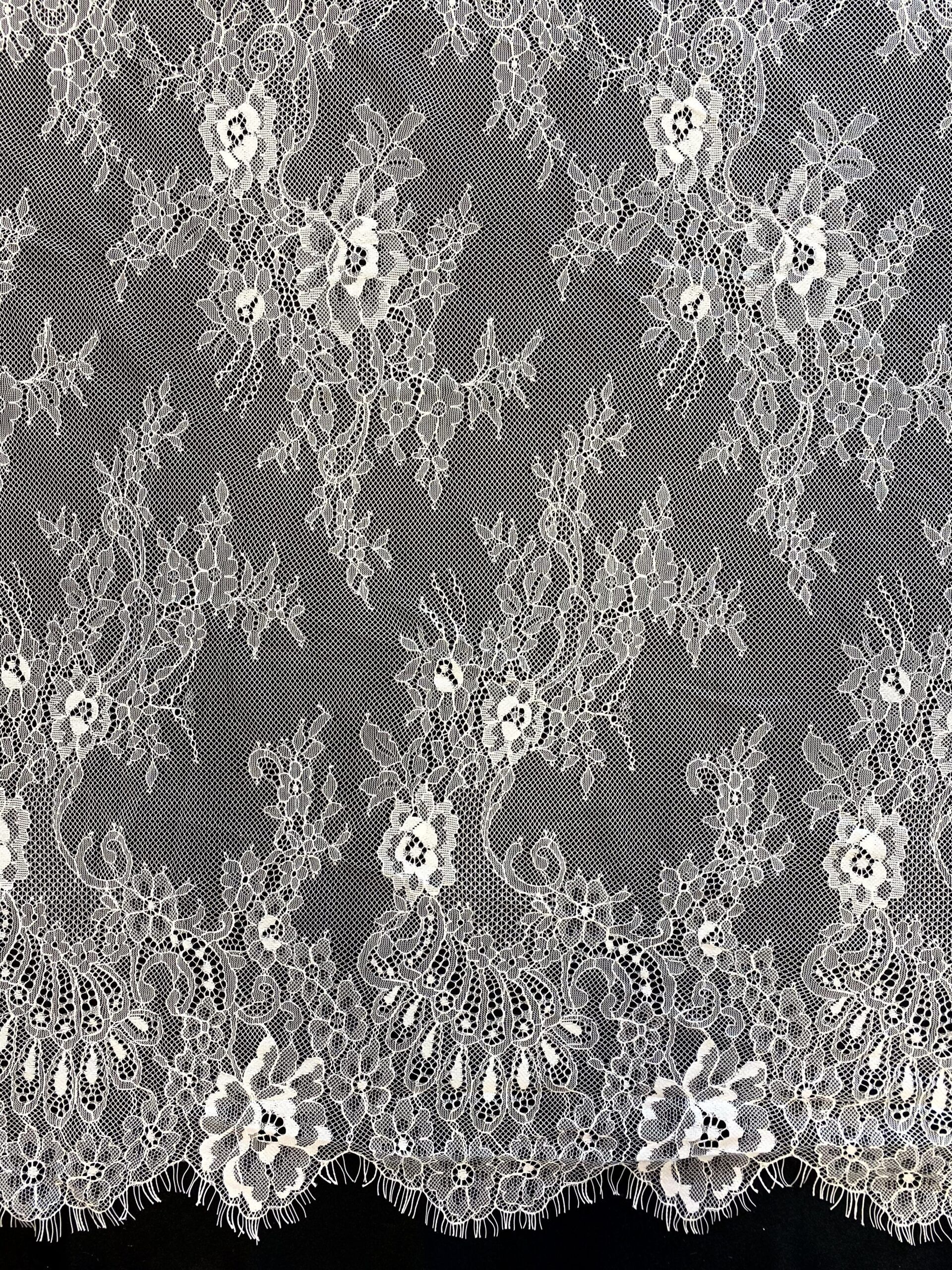 Törtfehér színű, tüll alapra hímzett francia csipke, dupla bordűrrel.