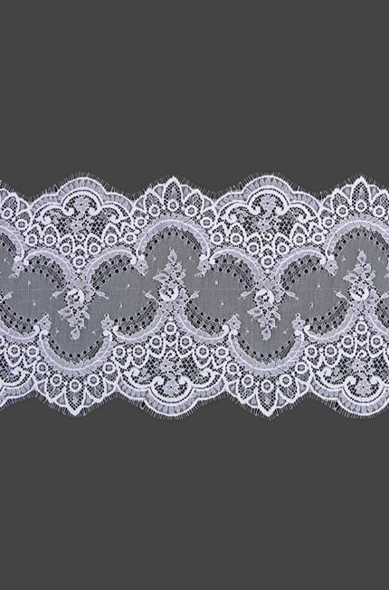 28-677 keleties hatású 28 cm széles fehér rachel (francia) csipke mindkét széle jellegzetes keleties hatású cakkos minta, ami jól alkalmazható esküvői és alkalmi ruha ujjra, dekoltázsra, derékvonalra.