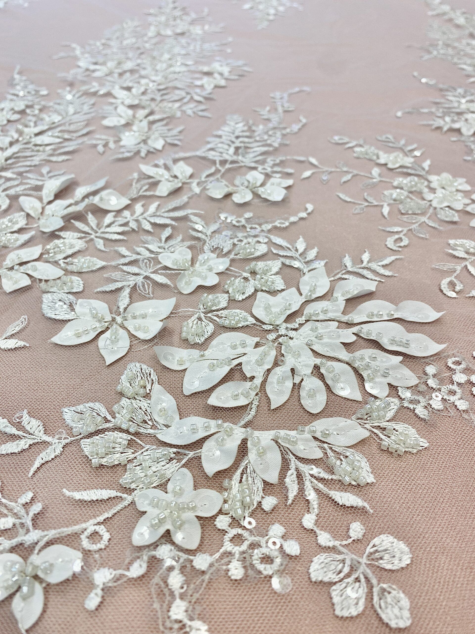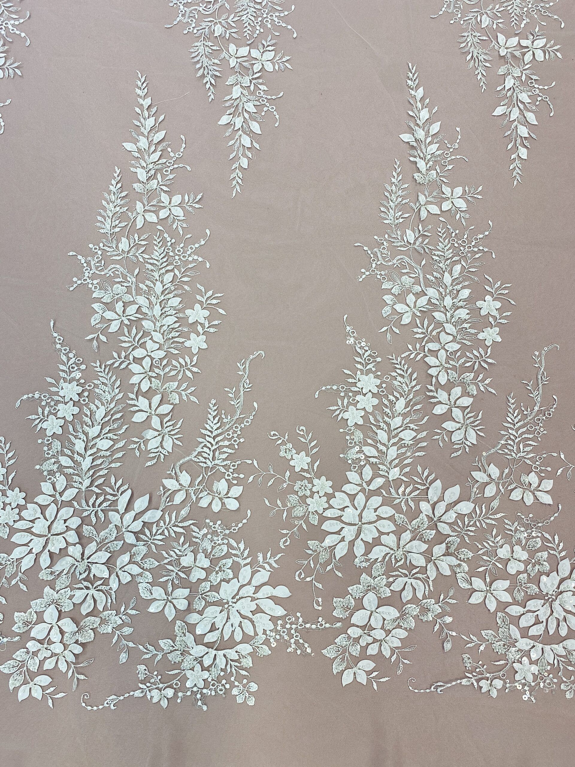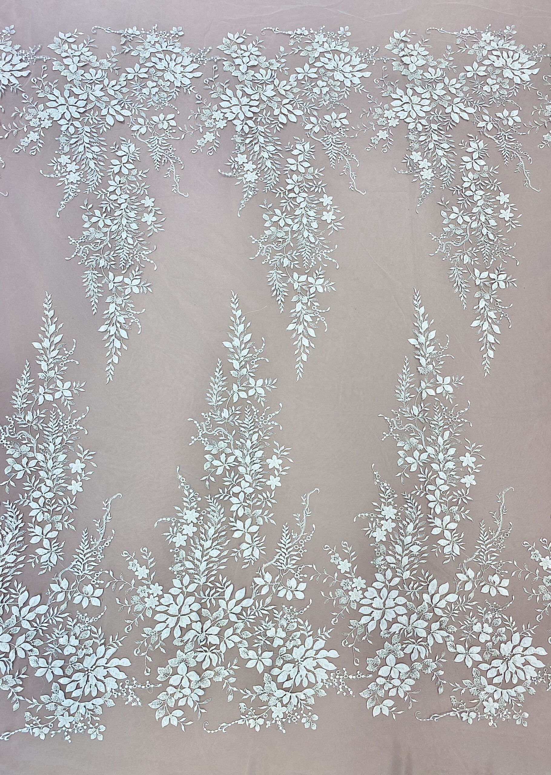 Törtfehér színű, tüll alapra hímzett, indás-leveles csipke anyag. Gyöngyökkel, flitterekkel és 3D düsessz levelekkel díszítve.