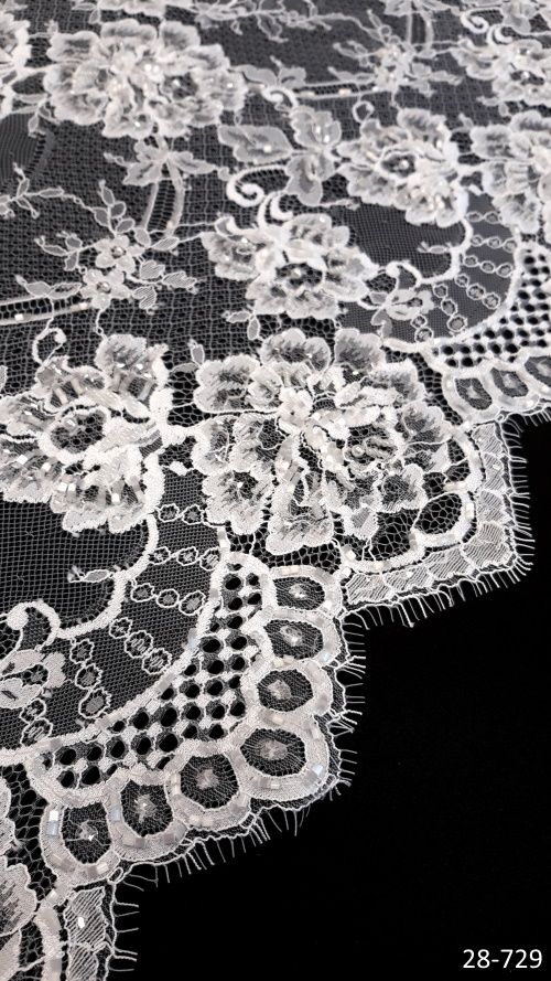Fehér rachel csipke, gyöngyökkel és flitterekkel díszítve, dupla bordűrrel esküvői ruhákhoz .
