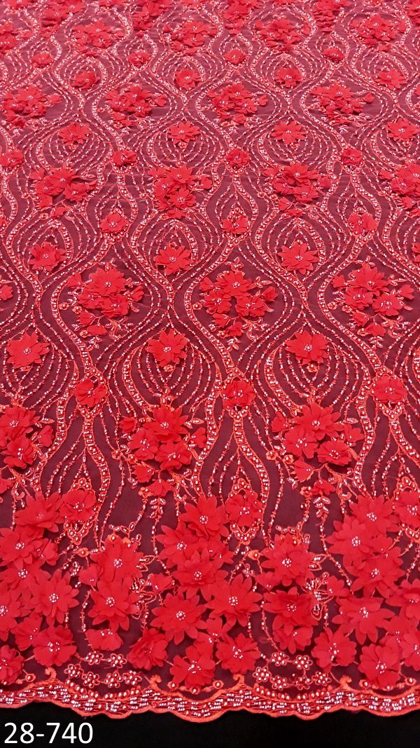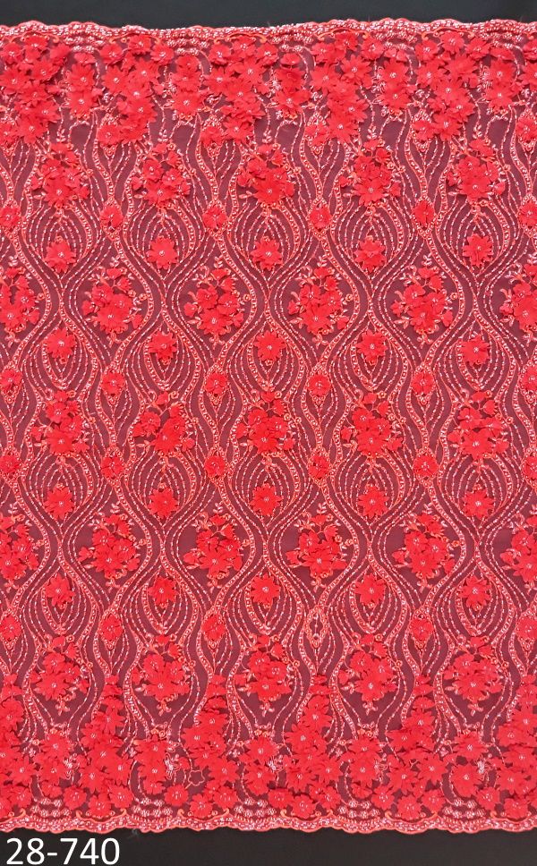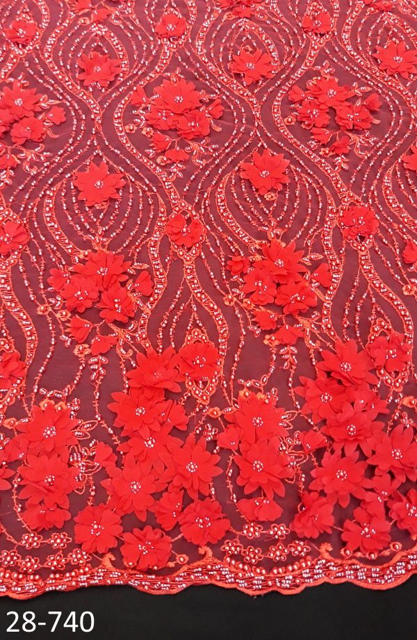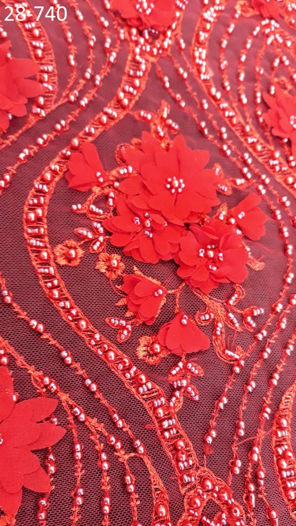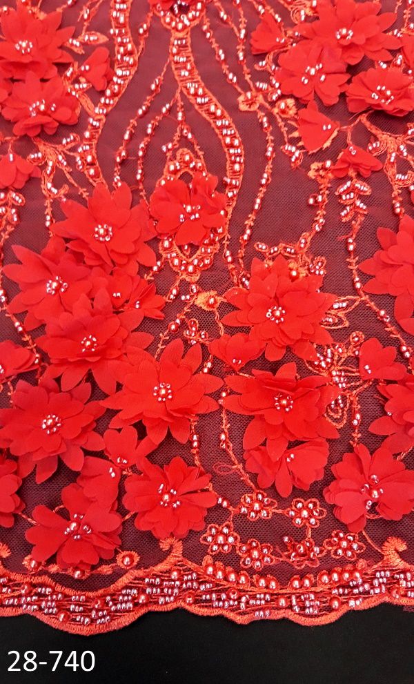 Piros színű, gyöngyökkel és 3D virágokkal díszített, tüllre hímzett csipkeanyag. A gyöngyözés és a virágok különlegesen gazdag megjelenést biztosítanak a belőle készült öltözéknek.