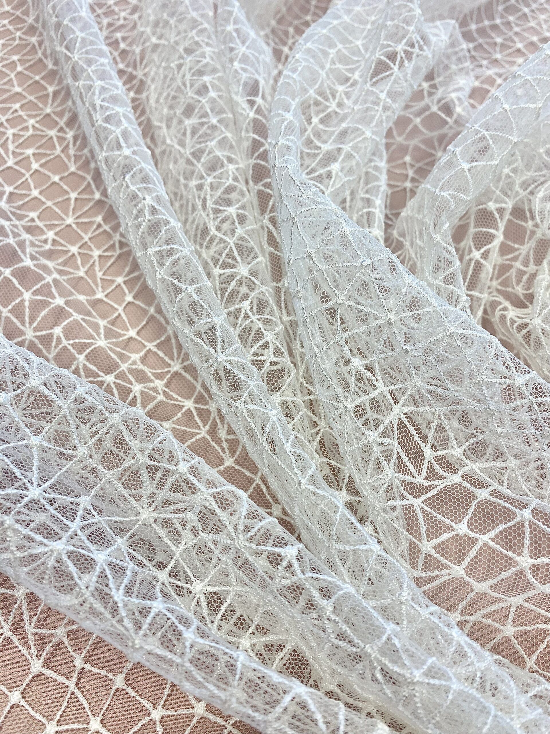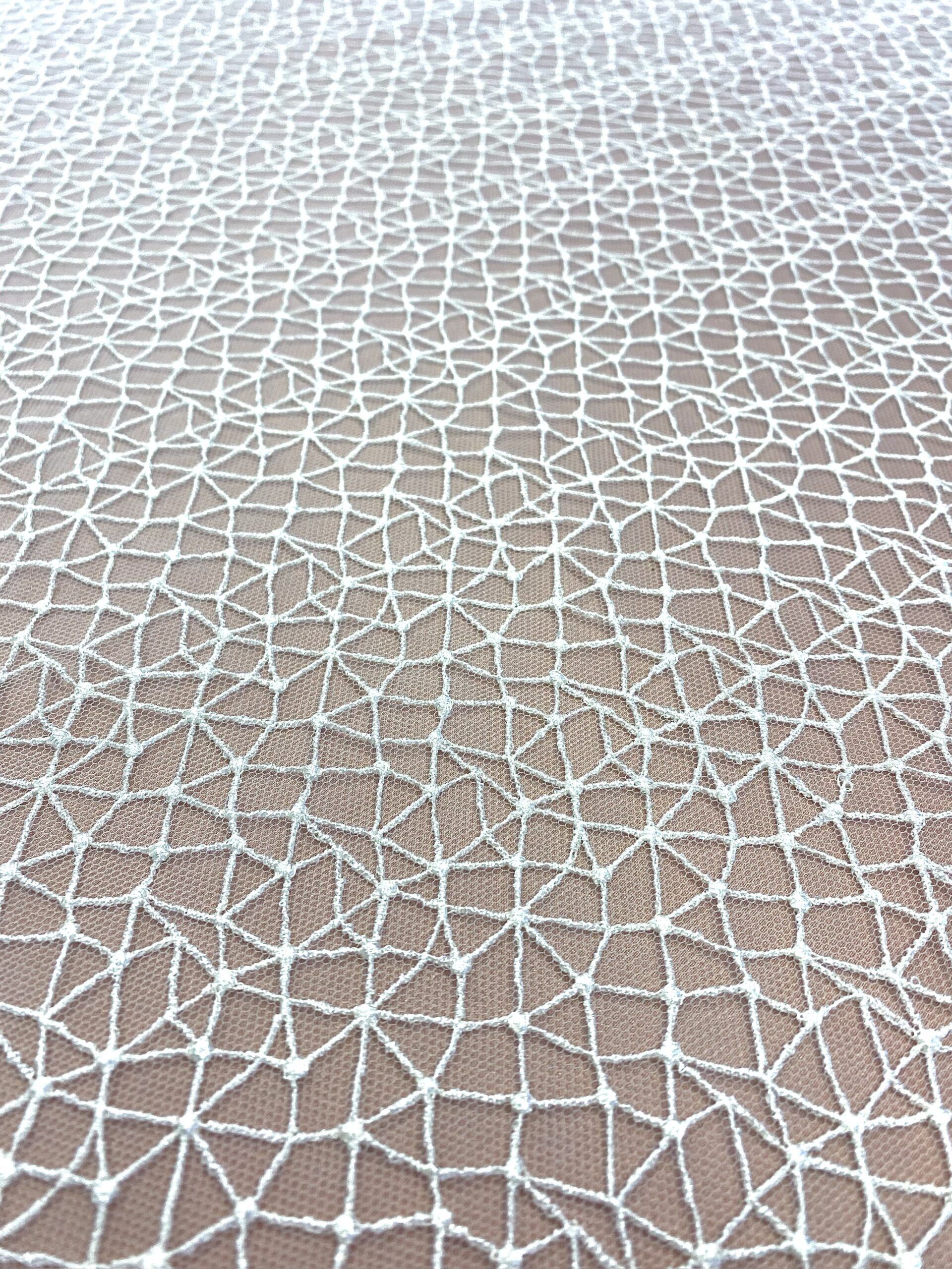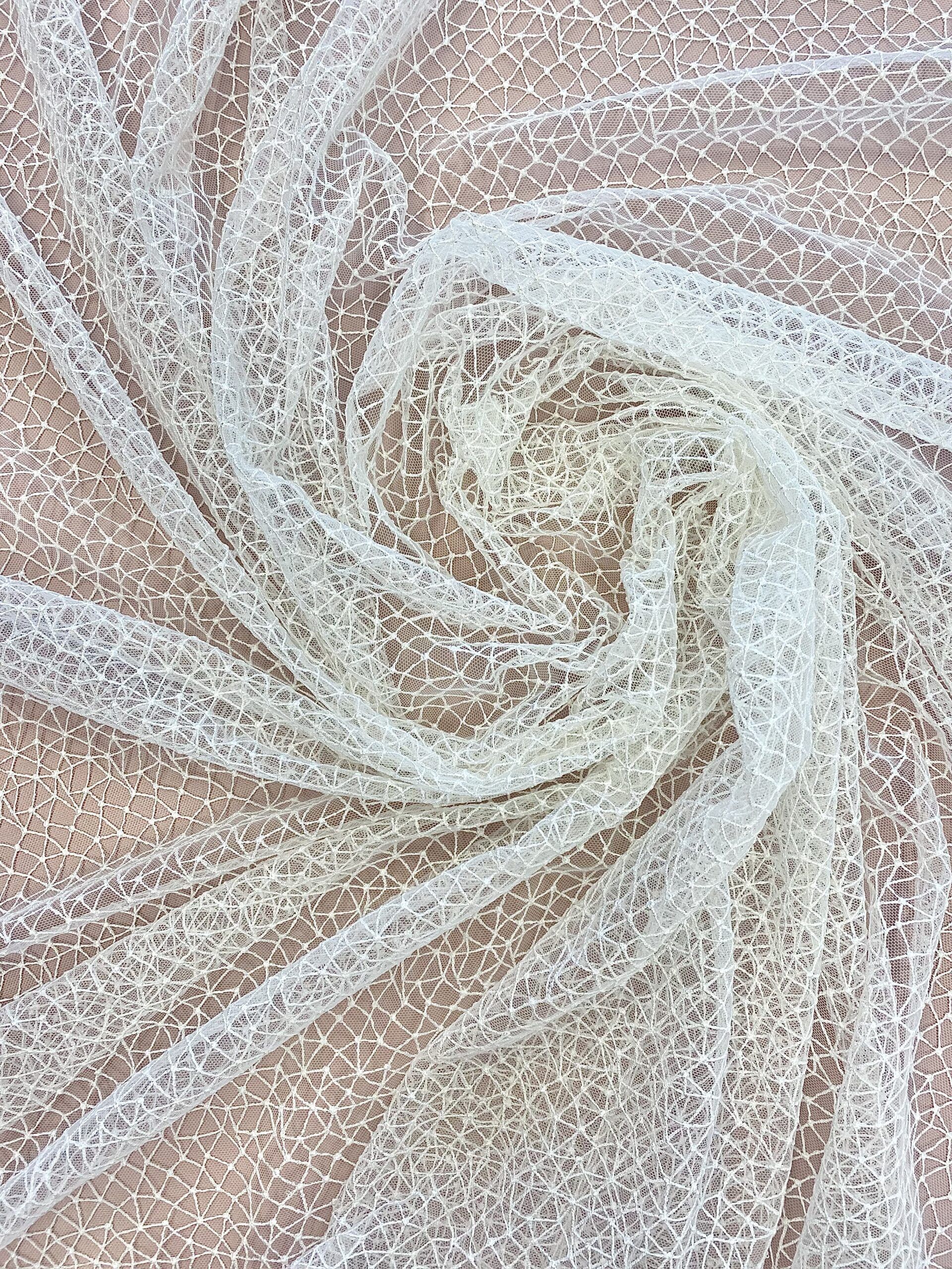 Ez a finoman hímzett, törtfehér csipkeanyag geometrikus hímzésével emeli ki a ruha részleteit. A minta nem túl sűrű, ezért megmarad a légies esés.