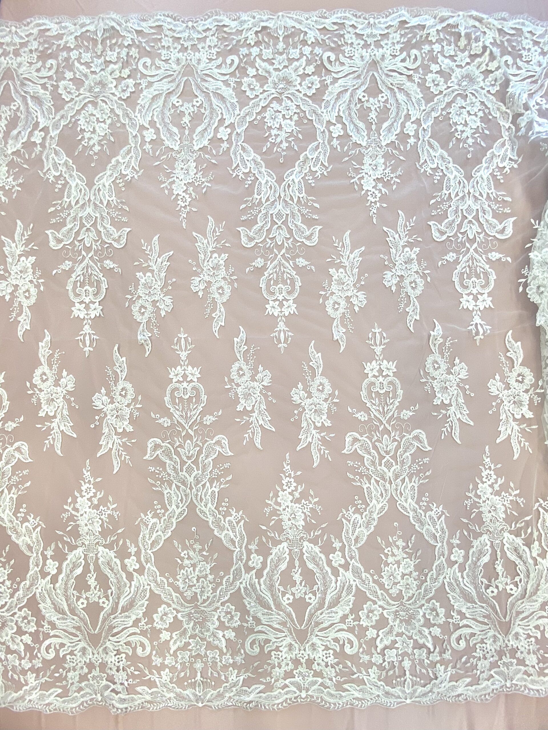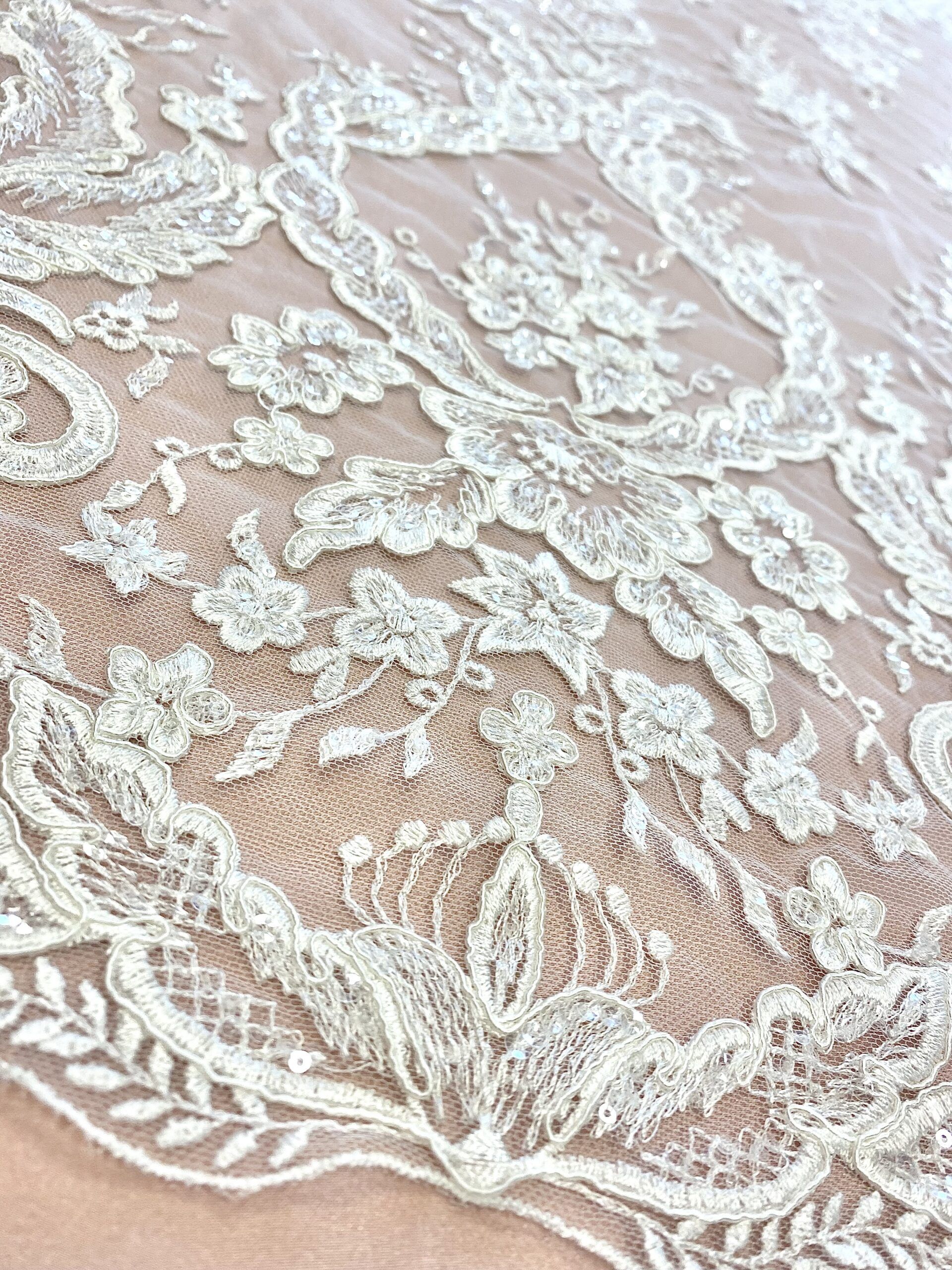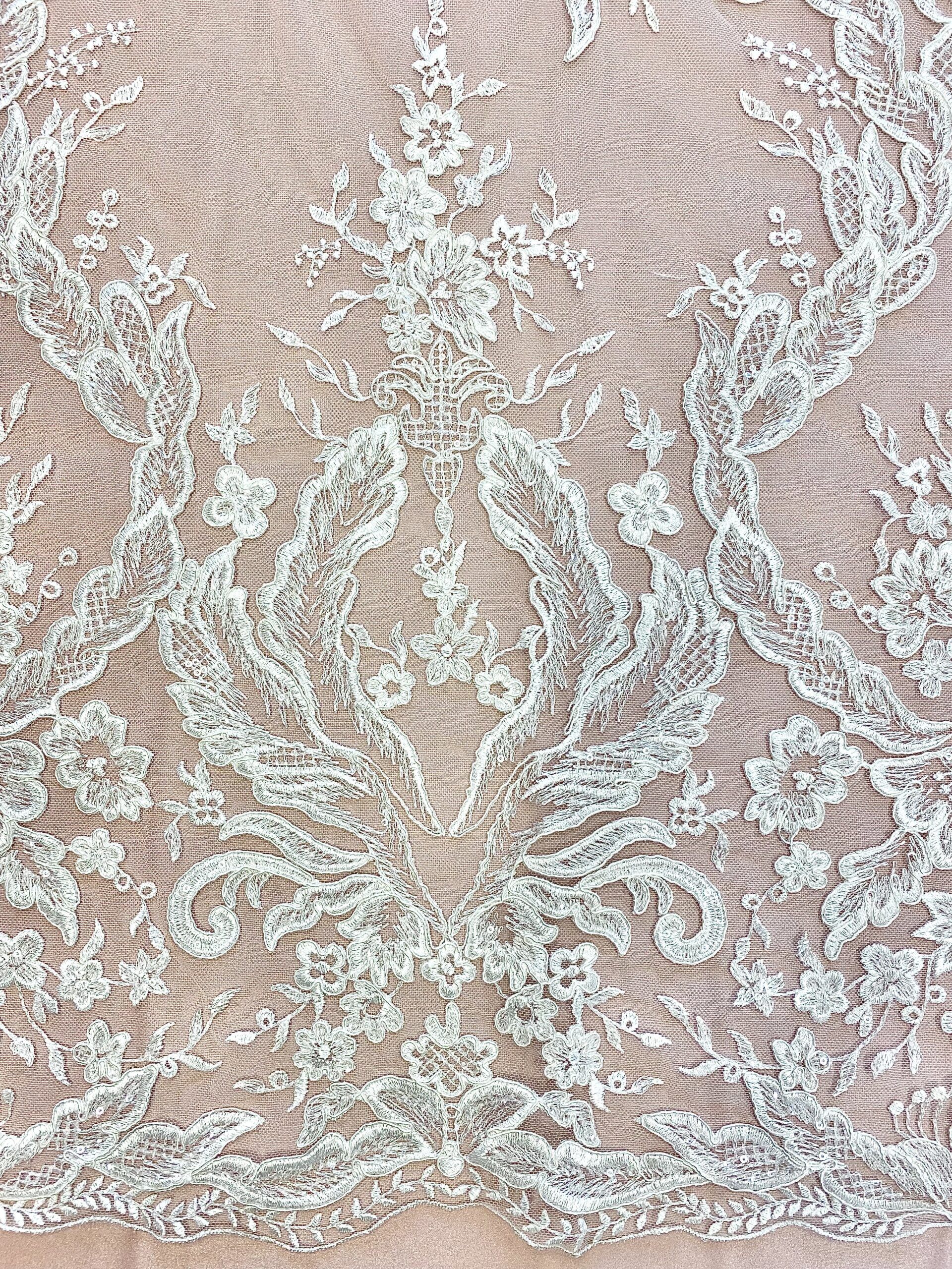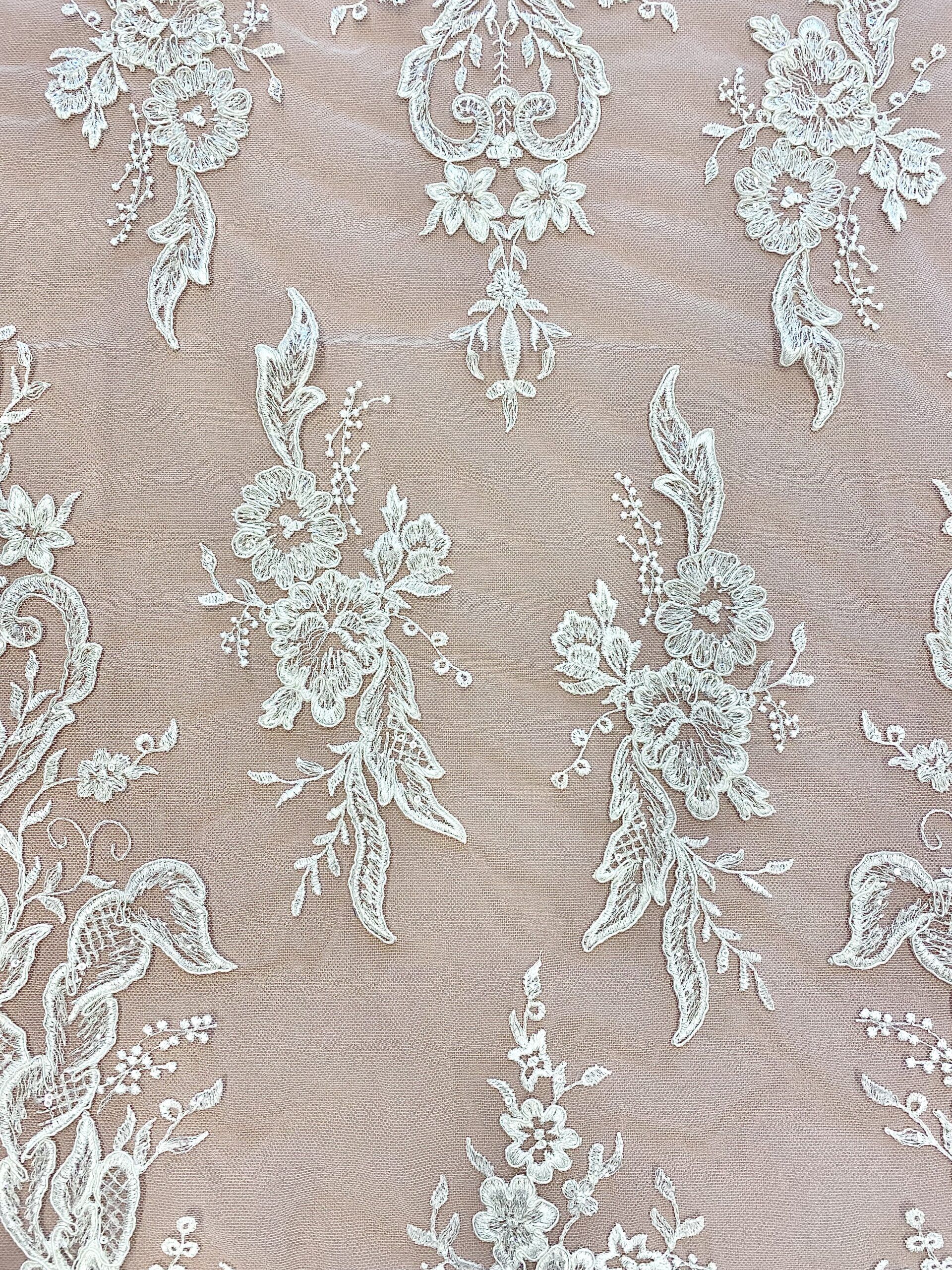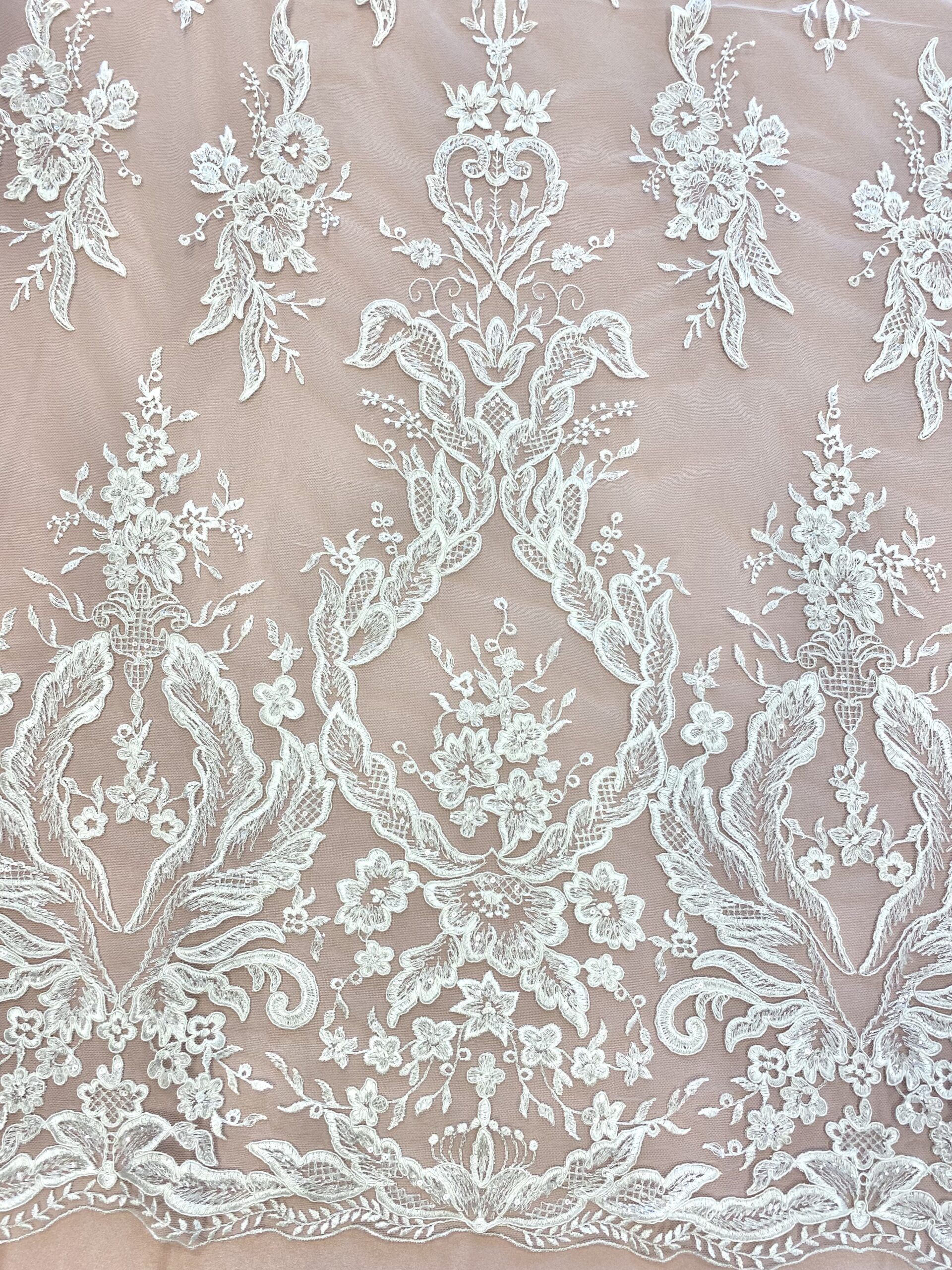 Barokkos jellegű, indás mintás törtfehér esküvői csipkeanyag flitter díszítéssel, amiből különleges menyasszonyi ruha felsőrészek készíthetők. A kitöltő minták páros csipkeként is felhasználhatók. Szegélye kiváló lehet a derékvonal vagy az ujjak lezárására. Mindkét oldalán bordűrös, így gazdaságosan felhasználható. A formákat finom zsinórozás emeli ki.