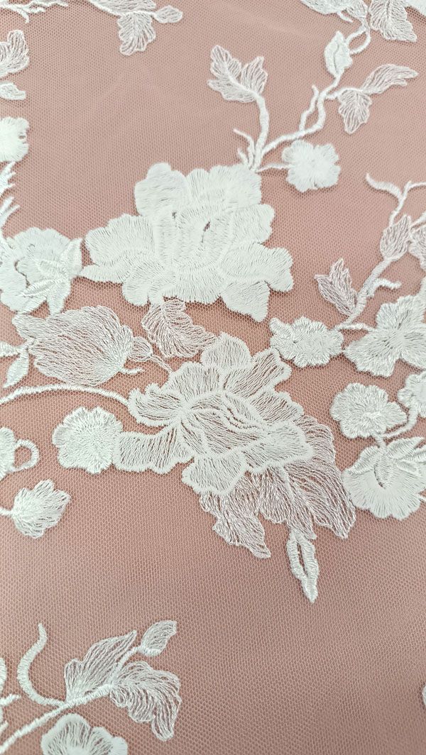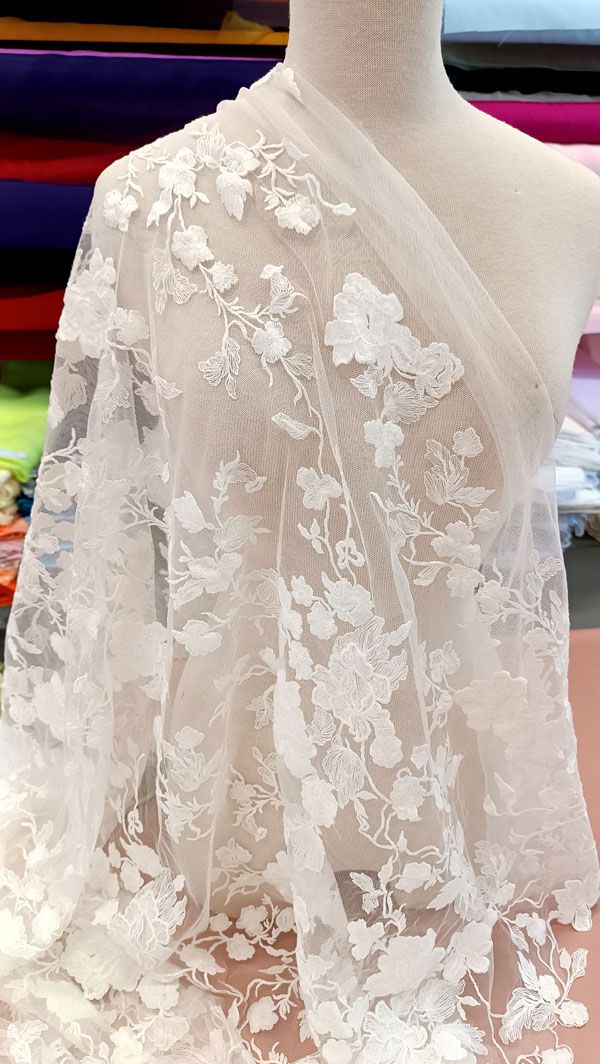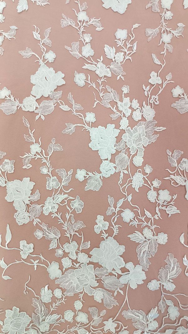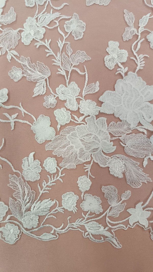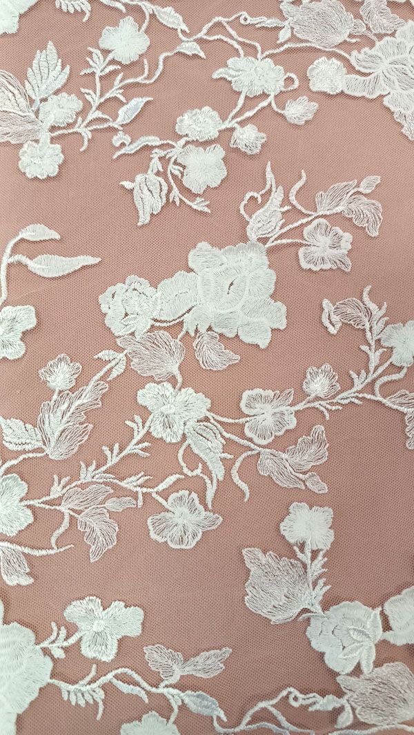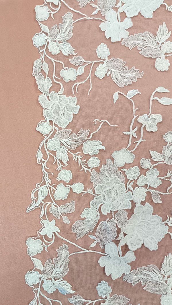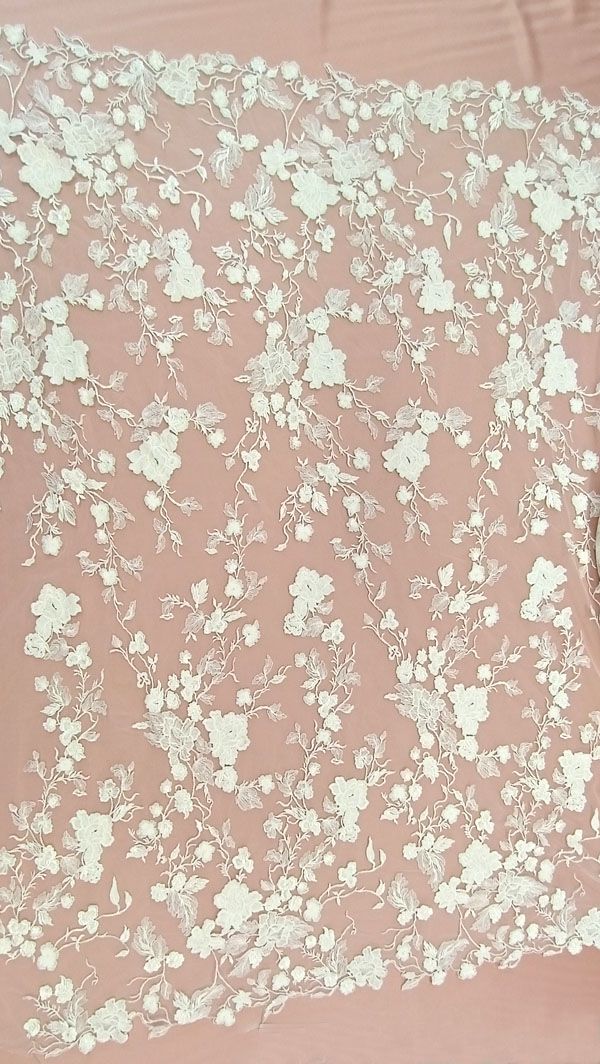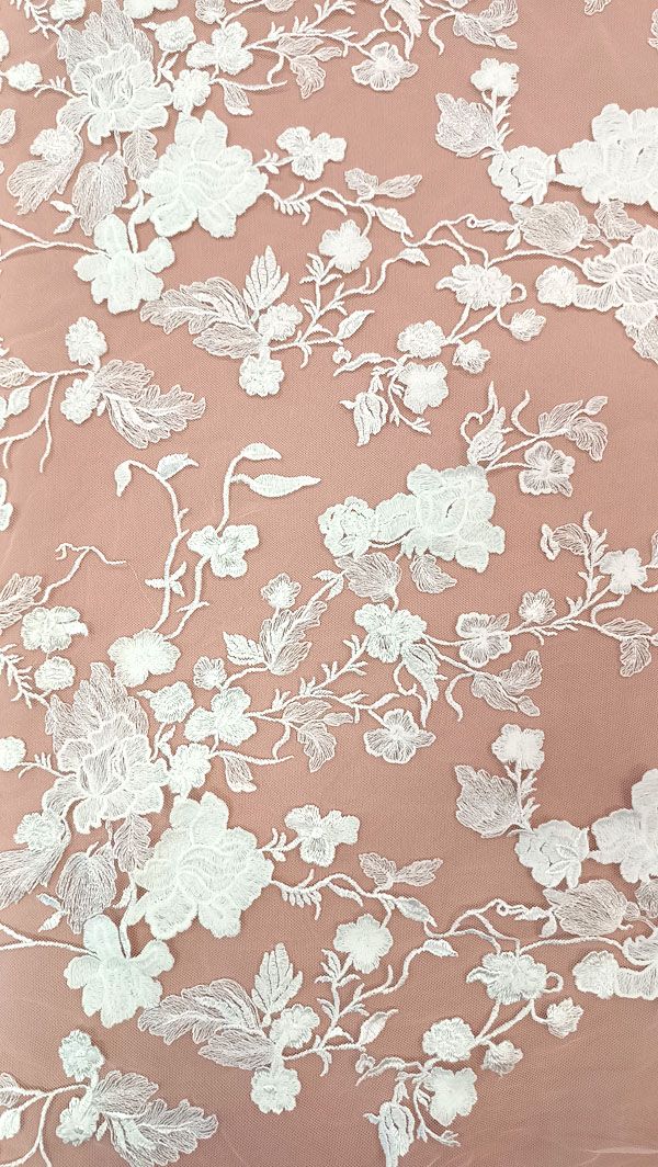 - Ez a gyönyörű gazdagon tüllre hímzett, törtfehér esküvői csipkeanyag egyedi gondossággal és kiváló minőséggel készült, hogy varázslatos és felejthetetlen ruhákat alkothasson belőle.