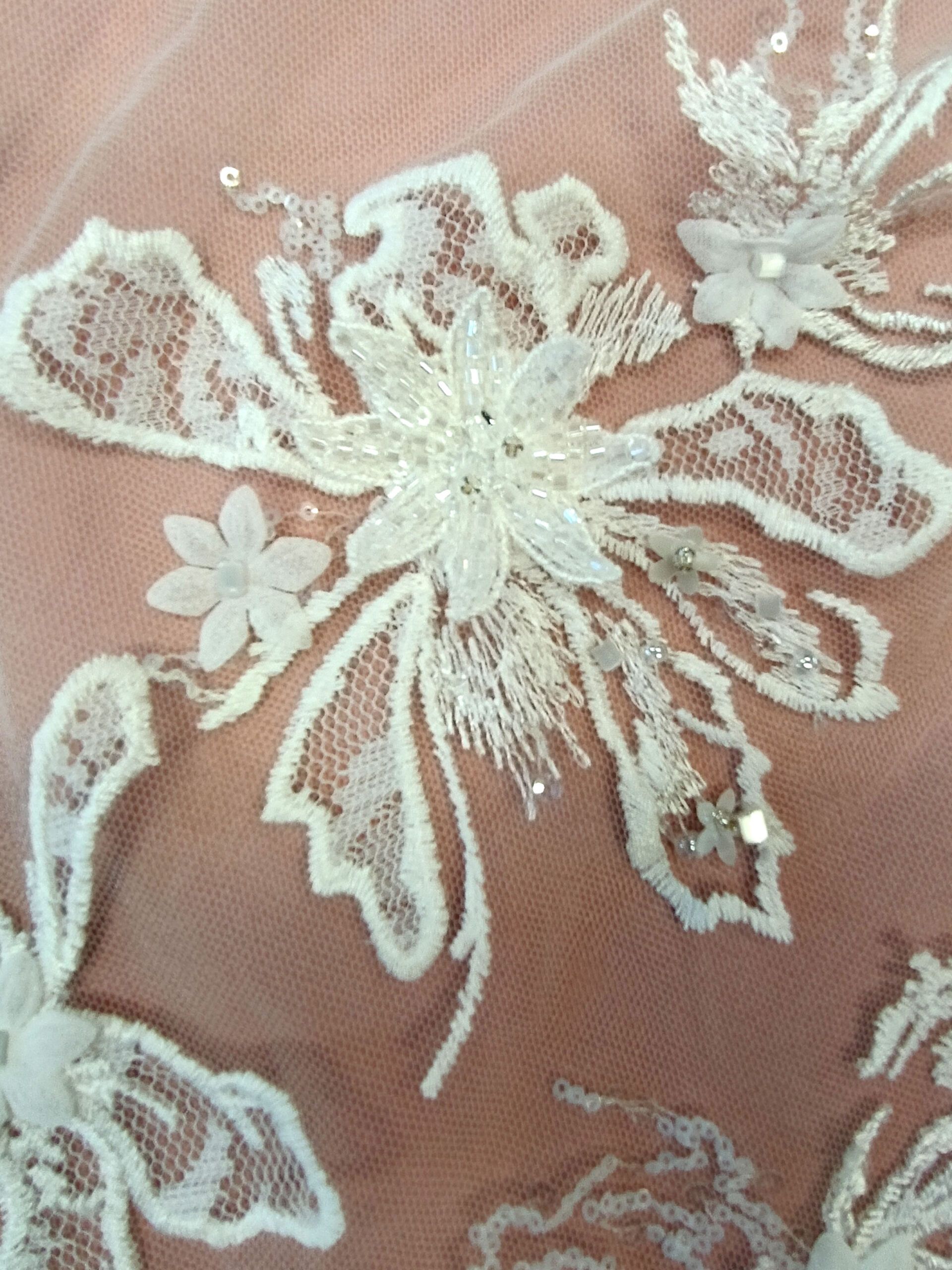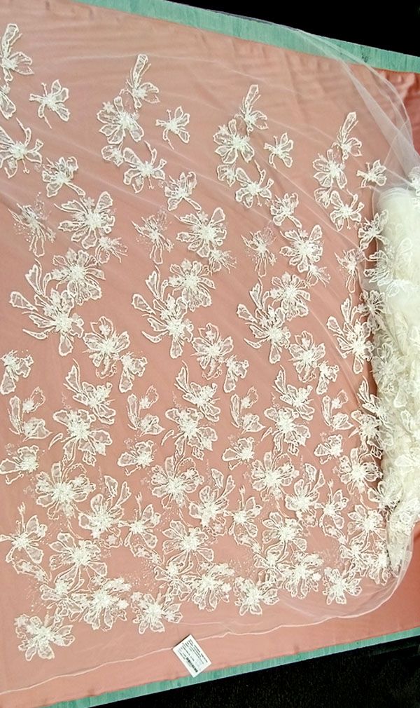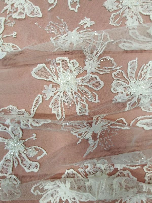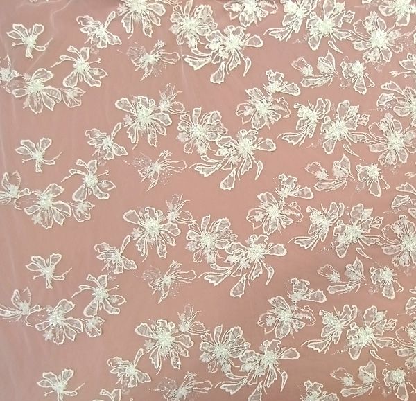 28-759 gyöngyös, 3D-s, törtfehér, esküvői csipkeanyag tüllre hímezve, 135 cm hímzés szélesség, több méretű motívumokkal esküvői ruhákhoz