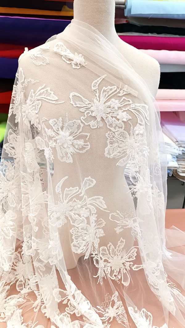28-759 – Gyöngyös, 3D-s, törtfehér esküvői csipkeanyag