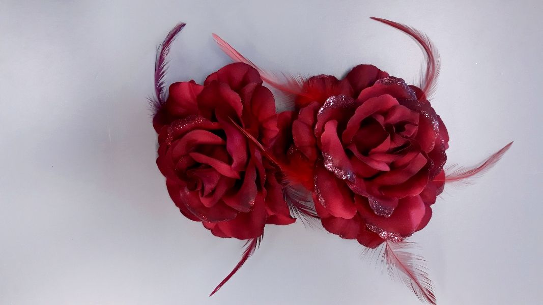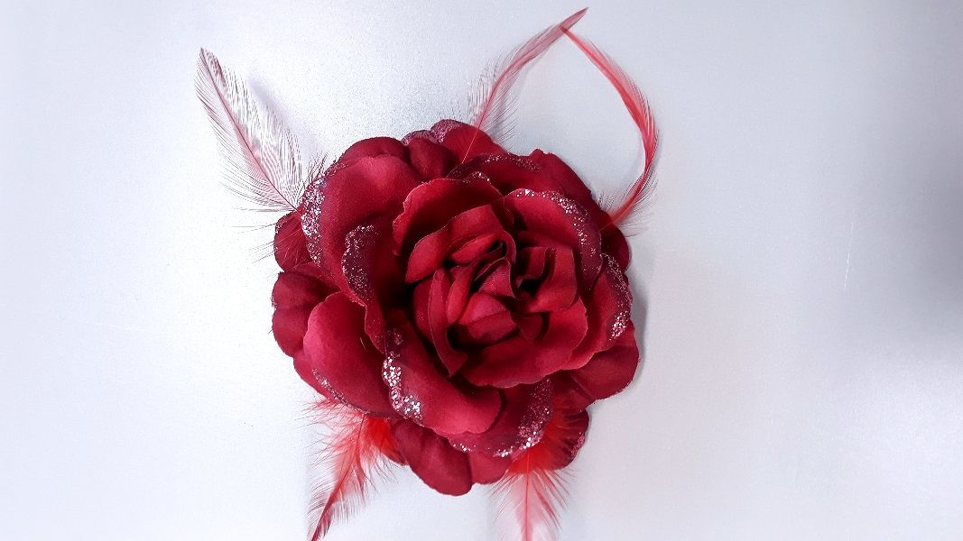 Bordó színű, tollas szatén virág.