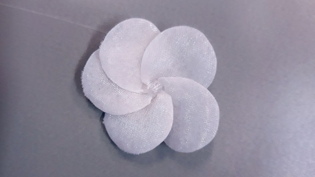 Fehér színű organza virág, közepén irizáló gyönggyel.