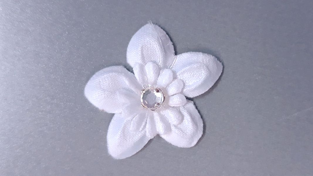 Fehér színű szatén virág, közepén kővel.