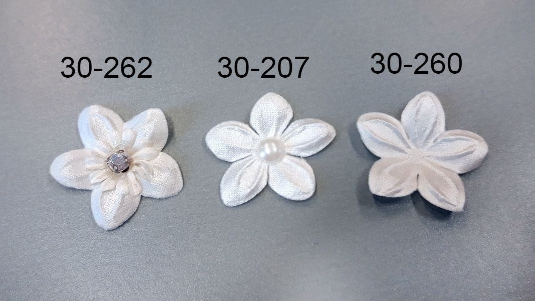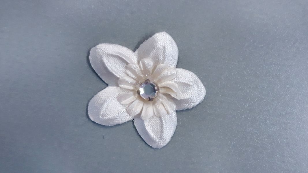 Krém színű szatén virág, közepén kővel.