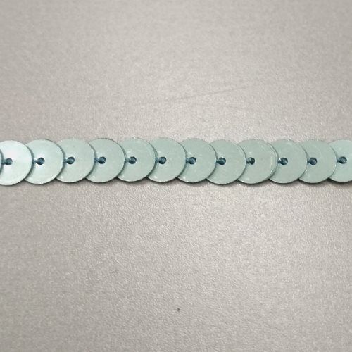 Világos türkizkék színű, anyagában színezett flitter. 6mm átmérőjű. Sorban összevarrva.